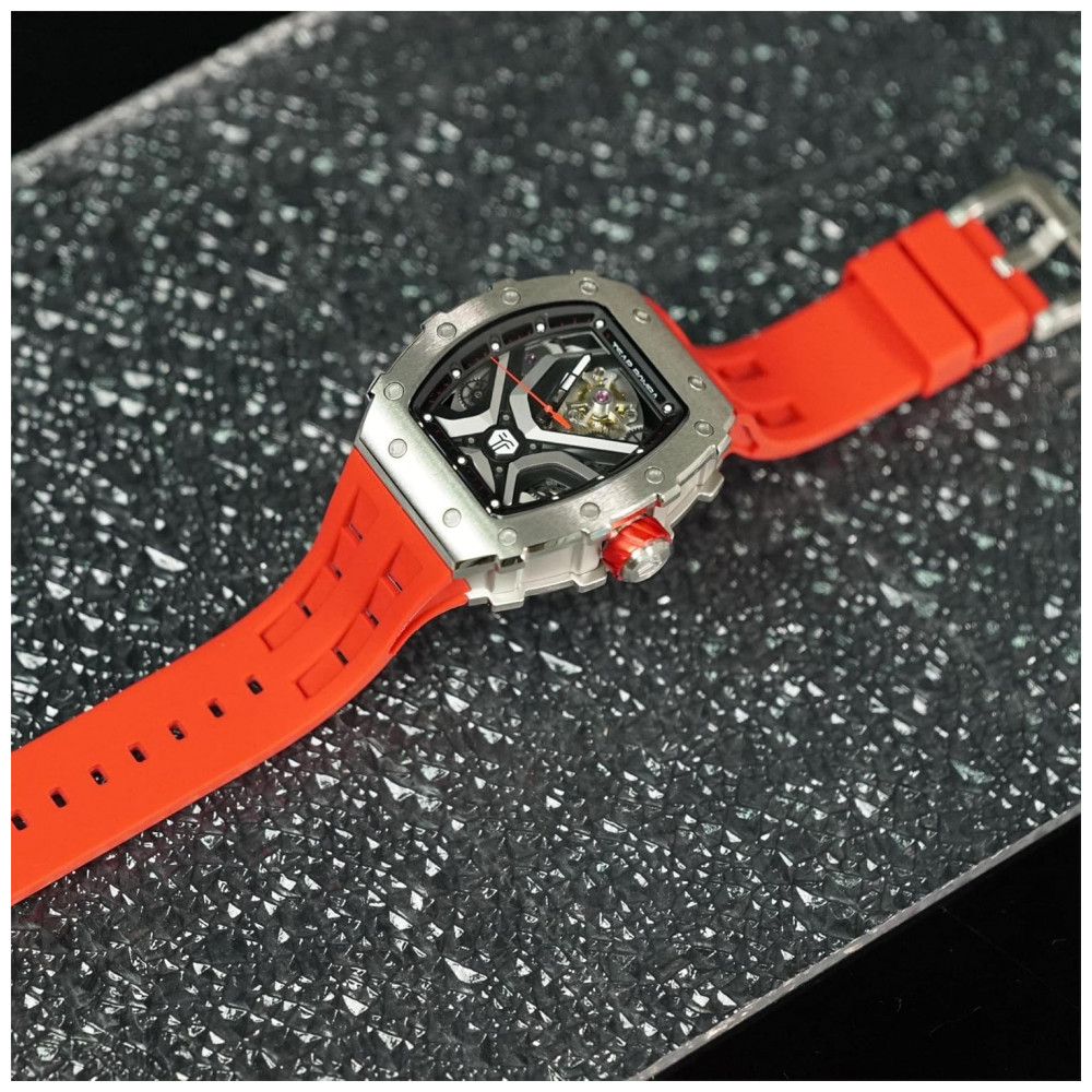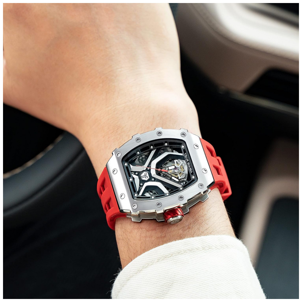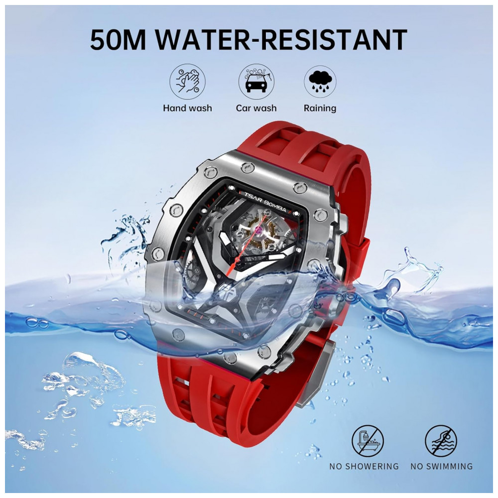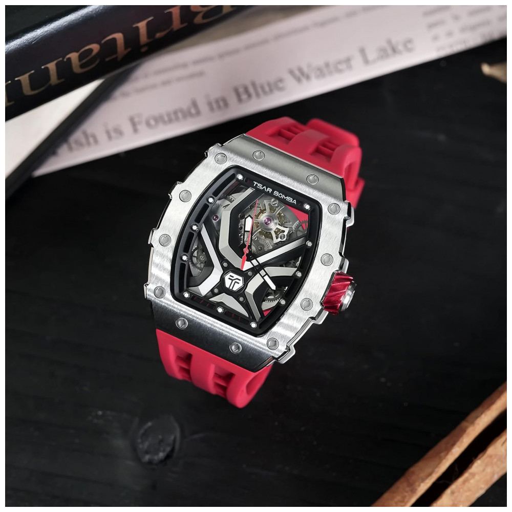 TSAR BOMBA Relógio Automático Masculino à Prova d’Água 50M Design Tonneau Luxuoso com Mecanismo Esqueleto e Pulseira de Silicone