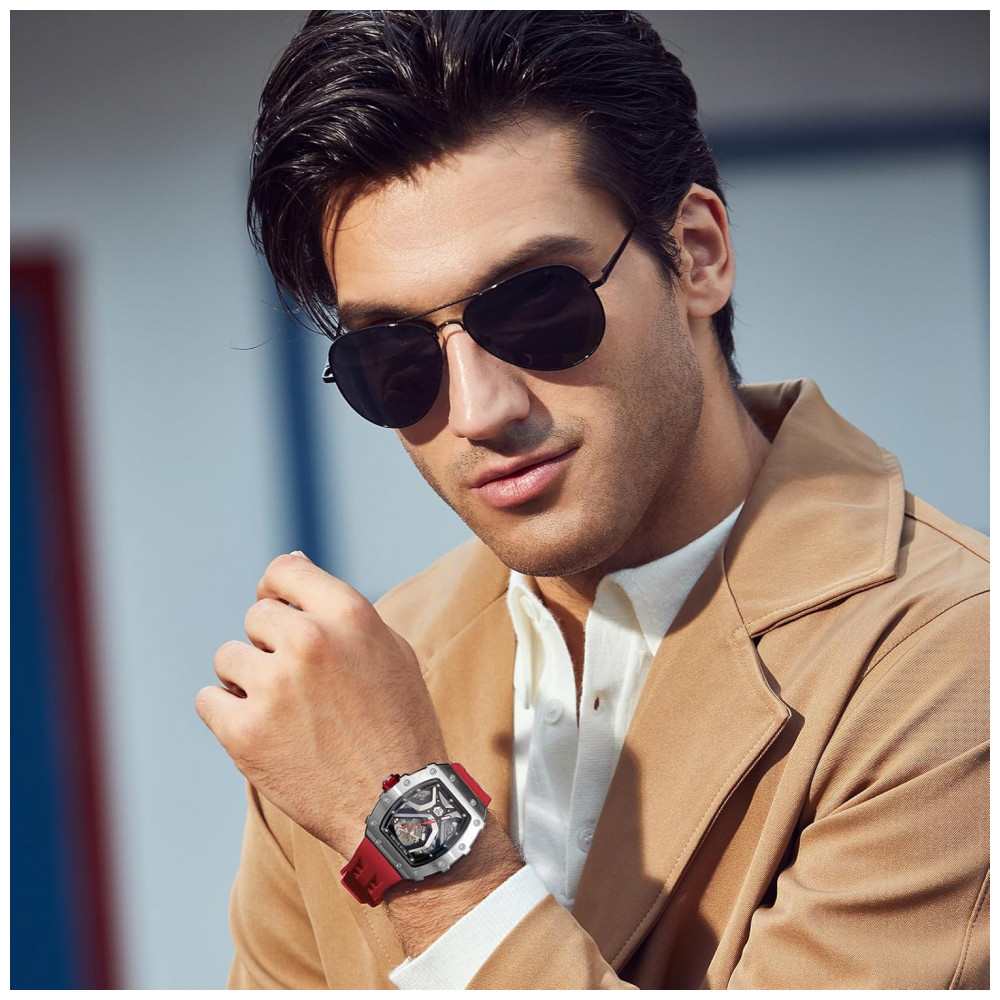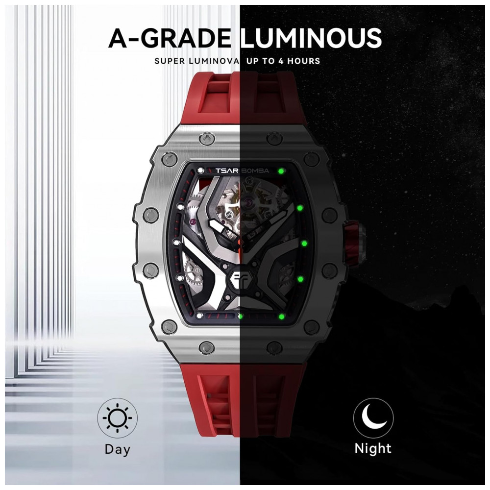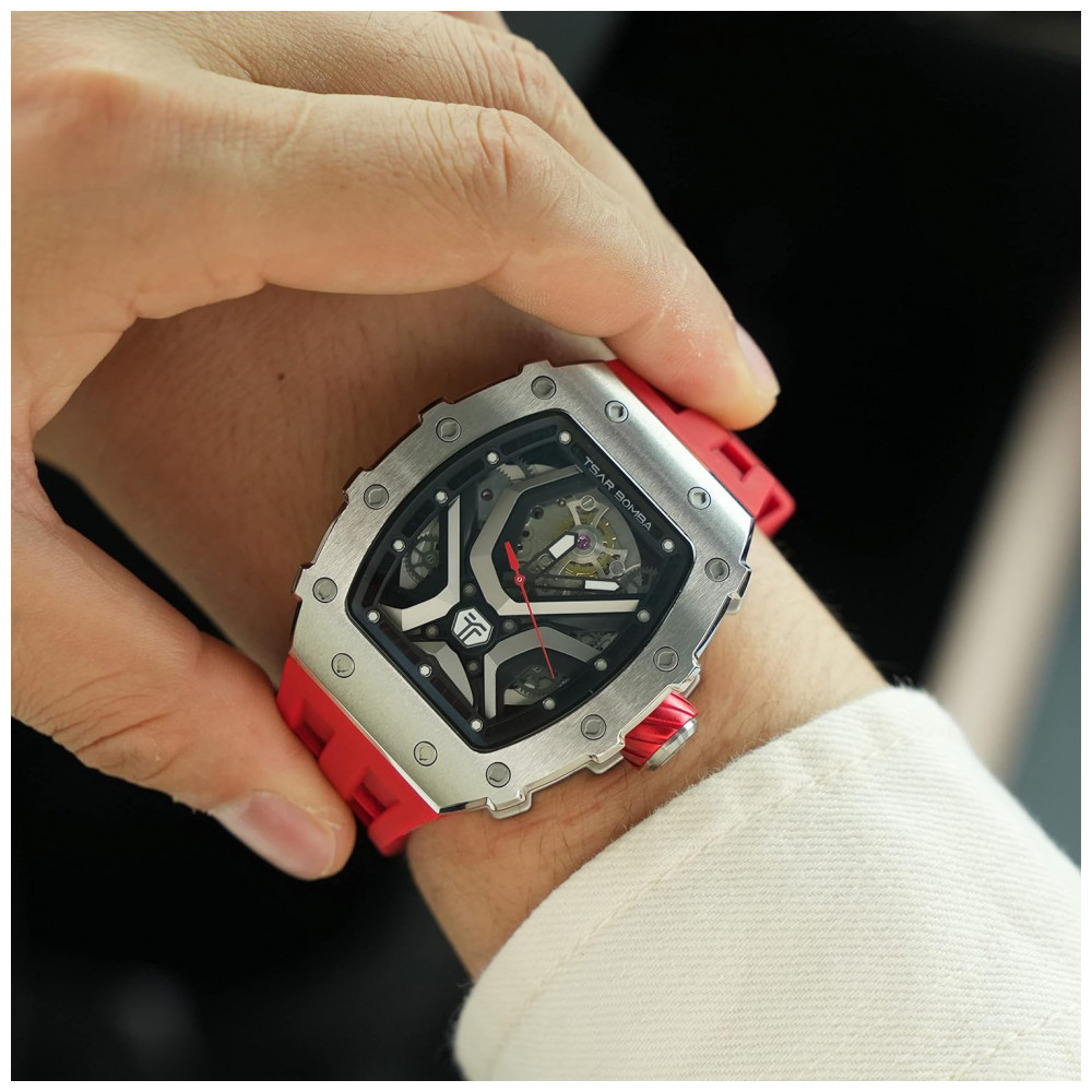 Descubra a elegância e a precisão do TSAR BOMBA, um relógio masculino automático que combina design inovador e funcionalidade superior. Com seu formato tonneau em dupla ponte arqueada, este relógio esqueleto mecânico destaca-se pelo encaixe perfeito no pulso e estilo moderno. O vidro é confeccionado em cristal de safira artificial, garantindo resistência a riscos e complementando perfeitamente a caixa em aço inoxidável 316L, que adiciona durabilidade e sofisticação ao modelo. Conta ainda com função luminosa de alta qualidade que ilumina os ponteiros no escuro, permitindo a visualização clara das horas sem ofuscar os olhos. Resistente à água até 50 metros, suporta o uso diário contra suor, chuva e respingos acidentais, mas não é indicado para natação ou mergulho. Atenção para não expor o relógio à água quente, pois variações extremas de temperatura podem comprometer a vedação e a impermeabilidade. A pulseira de silicone, com aproximadamente 22 cm de comprimento por 2 cm de largura, é confortável, respirável, resistente ao desgaste, antialérgica e ideal para uso prolongado. Disponível em diversas cores que se adaptam ao seu estilo. Equipado com movimento japonês automático de alta precisão, o TSAR BOMBA oferece funcionamento estável e exatidão no registro do tempo, garantindo eficiência em cada minuto e segundo. O acabamento IP plasma na caixa preserva o brilho por muito mais tempo, prevenindo o desgaste e o desbotamento. Este relógio é a escolha perfeita para presentear em ocasiões especiais como Natal, Dia dos Pais, Agradecimentos, aniversários, casamentos ou eventos casuais e corporativos, unindo luxo e charme em um acessório essencial para o homem contemporâneo.