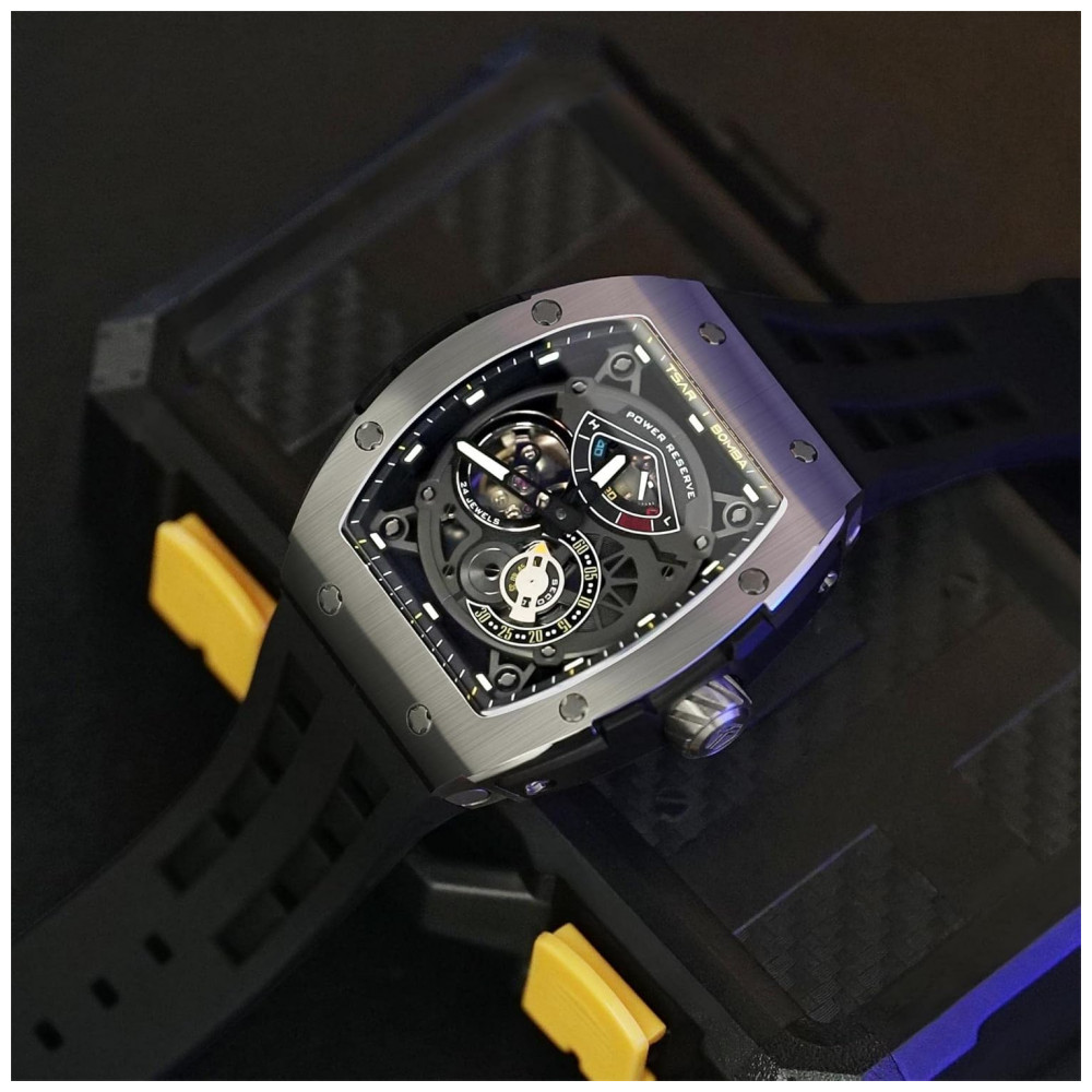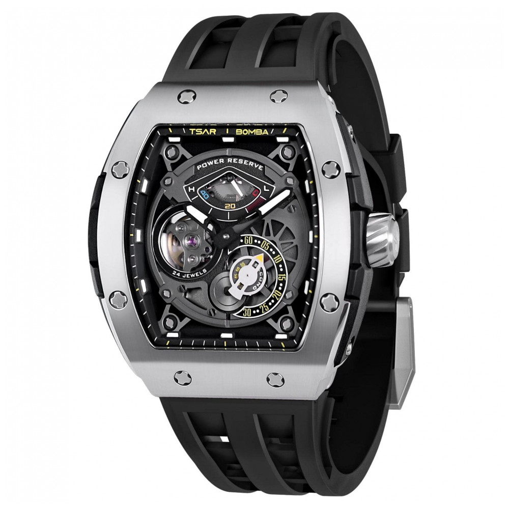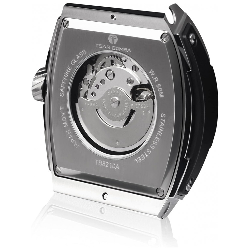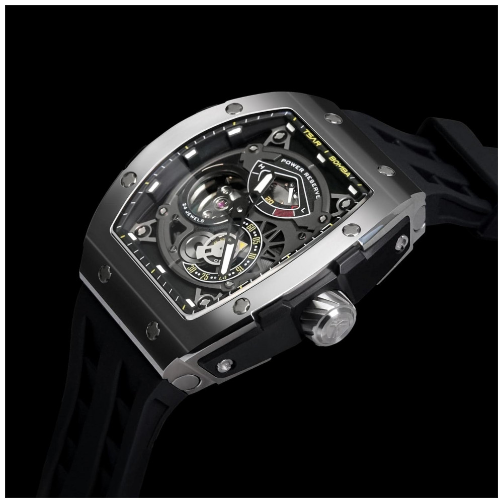 Relógio Automático Mecânico TSAR BOMBA Preto Mostrador Esqueleto Grande Ponteiro Luminoso Cristal Safira Sintética Correa FKM TB8210SIBLA