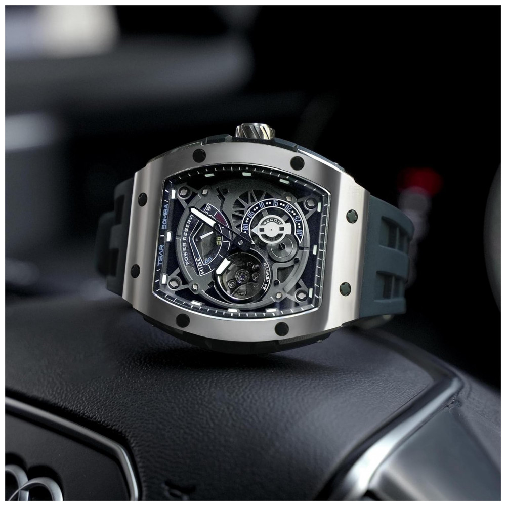 O relógio automático TSAR BOMBA TB 8210 é uma obra-prima da relojoaria mecânica que alia alta qualidade e artesanato refinado. Seu design skeletonizado revela a complexidade do movimento mecânico, expondo a beleza da arte horológica. O mostrador apresenta um indicador de reserva de energia às 12 horas, similar ao medidor de combustível de um carro: quando o ponteiro alcança a zona vermelha, indica que é necessário realizar a corda manual para armazenar energia. A caixa é confeccionada em aço inoxidável 316L, conhecido por sua alta resistência à corrosão e toque agradável, sendo seguro para a pele. O cristal é de safira sintética, com dureza excepcional de até 1600HV, garantindo proteção contra riscos no uso diário. A pulseira colorida de fluoroelastômero é resistente ao suor, respirável e durável, promovendo conforto prolongado durante o uso. Com resistência à água de até 50 metros, este relógio suporta transpiração, chuva e respingos acidentais, embora não seja recomendado ajustar a coroa submerso ou usar em ambientes com água quente, como sauna ou banhos. Seu sistema luminoso avançado permite a visão clara das horas no escuro sem incomodar os olhos. Equipado com um renomado movimento japonês de corda automática, o TSAR BOMBA TB 8210 oferece precisão e estabilidade, assegurando que você não perca compromissos importantes. Seu design elegante e diferenciado agrega sofisticação e destaque em qualquer evento.