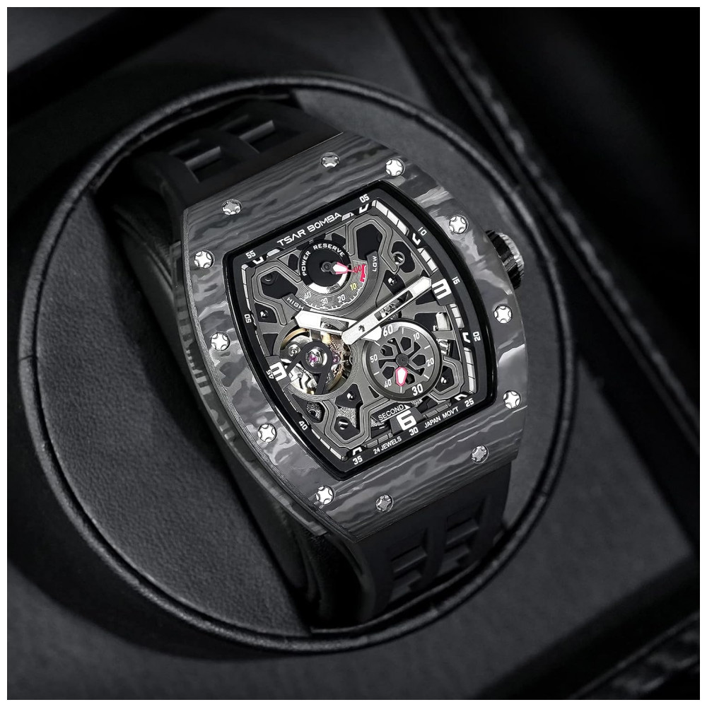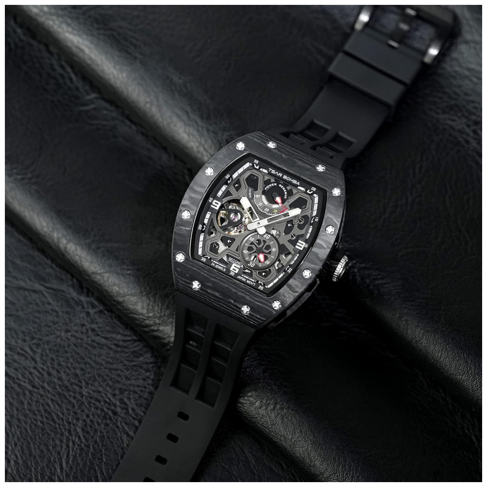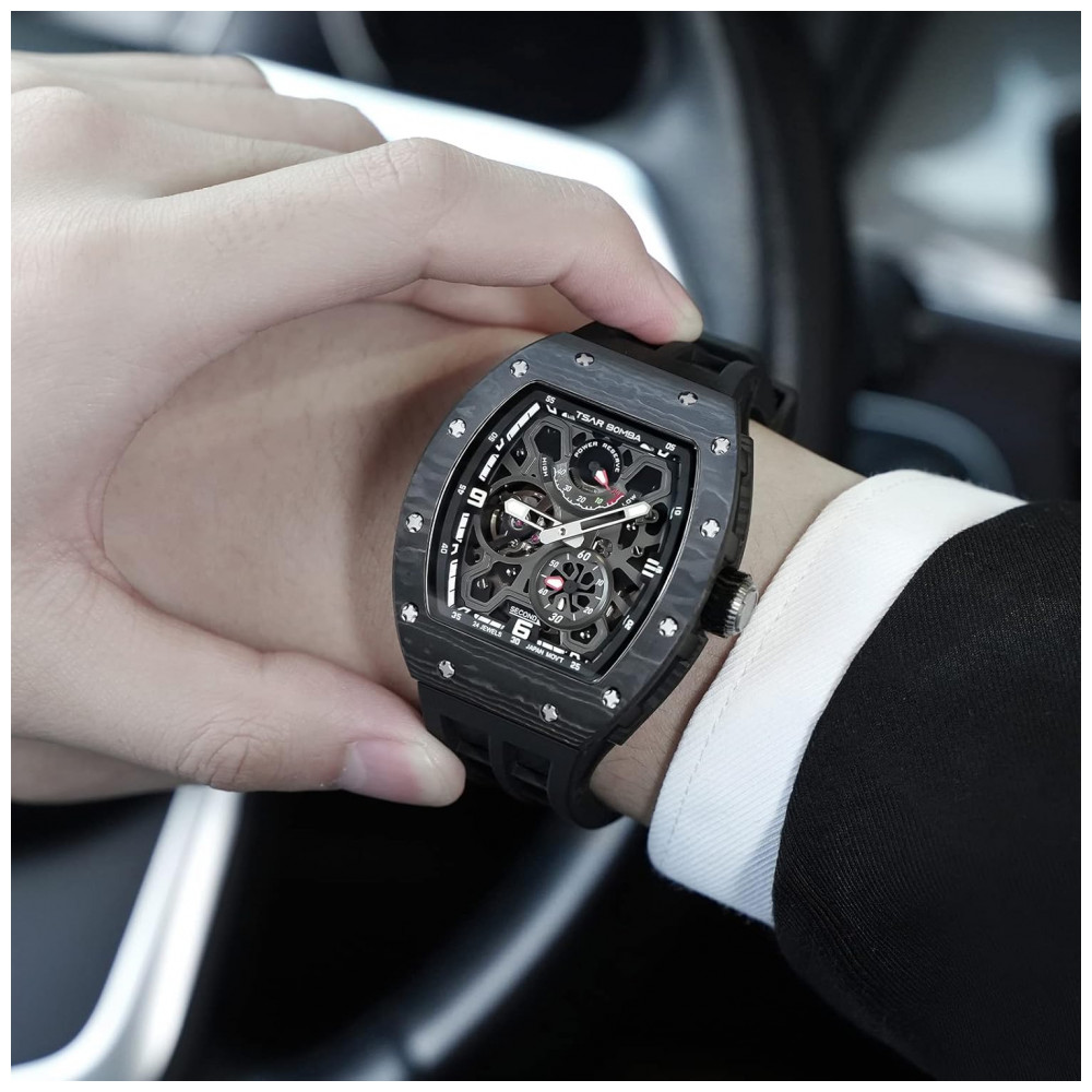 TSAR BOMBA Relógio Masculino Automático Luxo com Bisel em Fibra de Carbono e Cerâmica Vidro de Safira e 50M à Prova d’Água