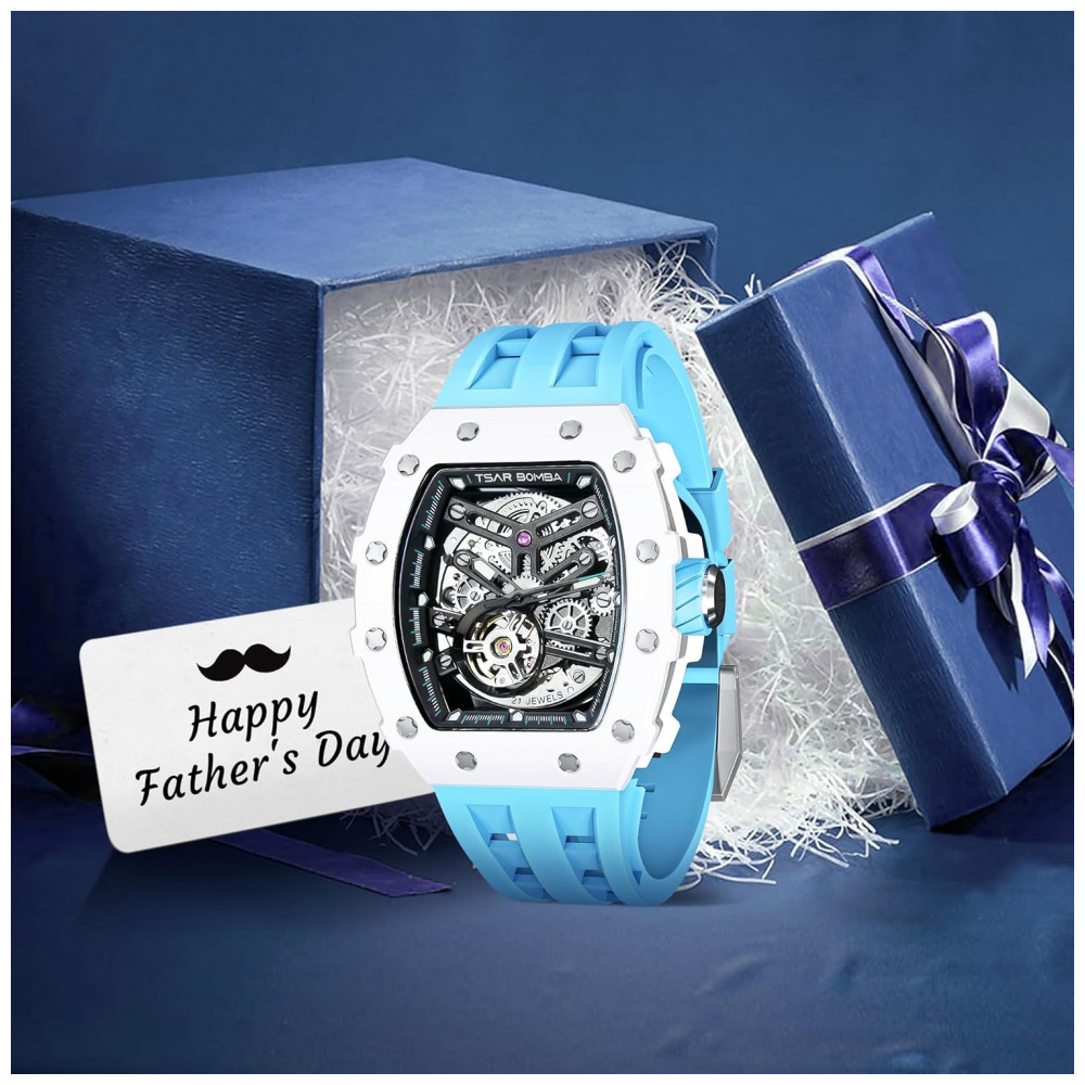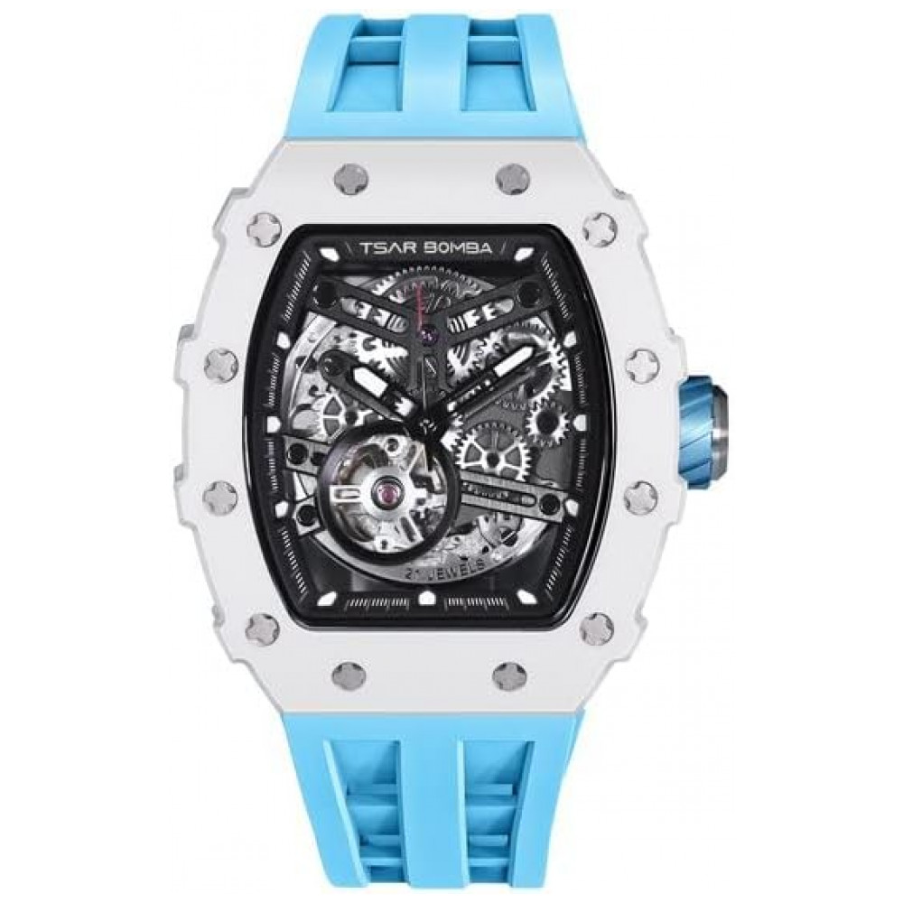 TSAR BOMBA Relógio Masculino Automático Luxury Esqueleto Quadrado com Cristal de Safira Silicone 50M Resistência à Água