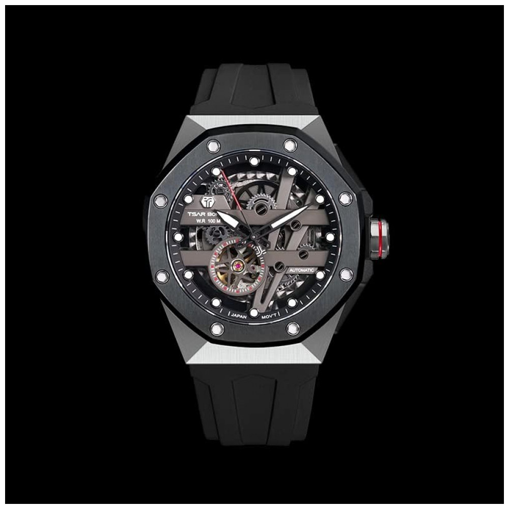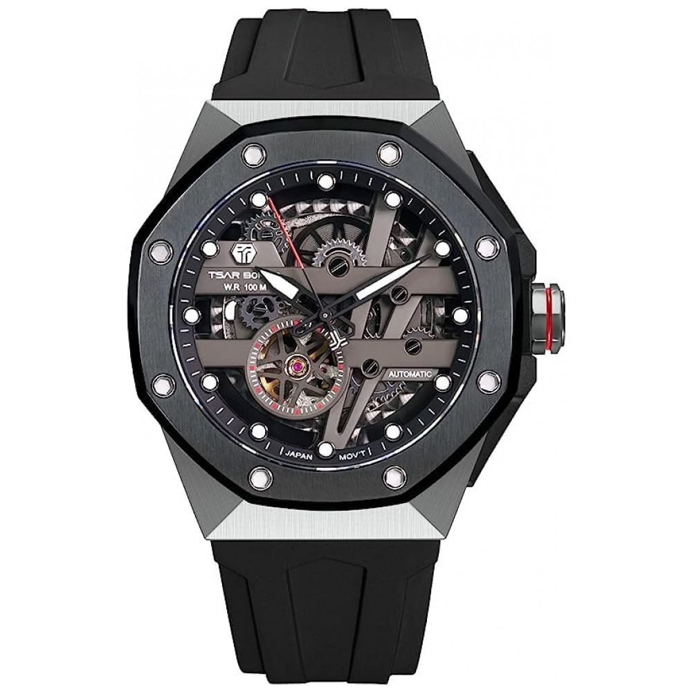 TSAR BOMBA Relógio Masculino Automático Mecânico Skeleton 10ATM à Prova d’Água Mostrador Octogonal Luxo com Pulseira de Borracha FKM Preta