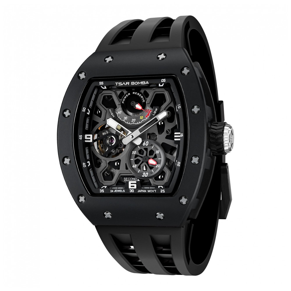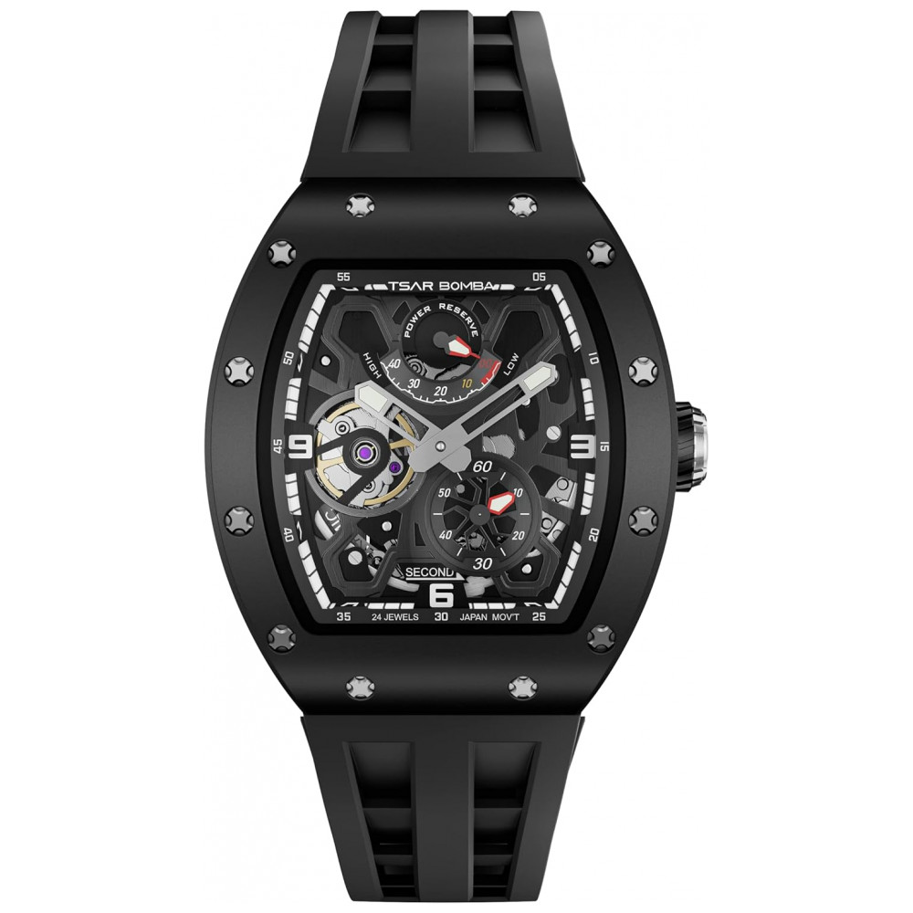 Experimente a leveza e a inovação com o Relógio Mecânico Automático TSAR BOMBA 8212, equipado com uma estrutura ultraleve em fibra de carbono dupla face. Seu design interno exclusivo e inovador demonstra a excelência da marca ao utilizar materiais avançados para garantir alta resistência e durabilidade. O relógio possui um movimento esqueleto com 24 rubis que minimizam o desgaste das peças, prolongando significativamente a vida útil do produto.