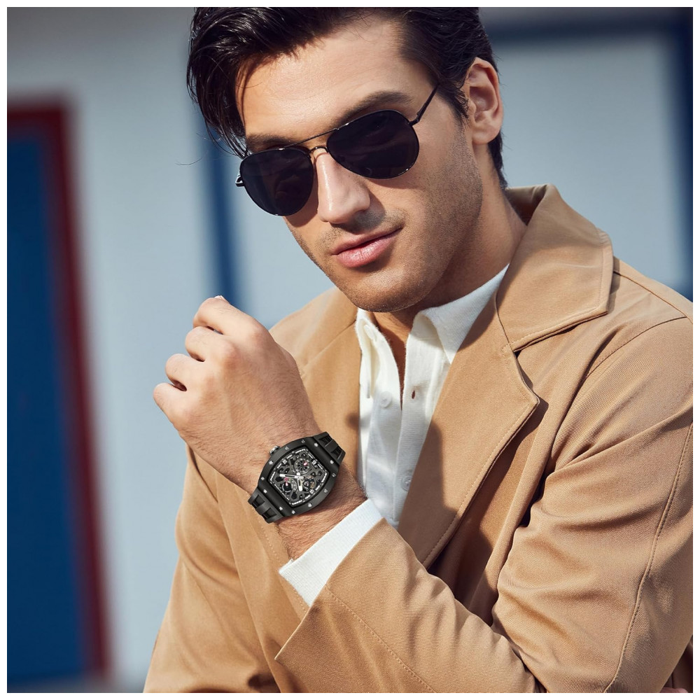 Seu design tonneau (formato barril) se ajusta confortavelmente ao pulso, garantindo um visual elegante e versátil, ideal para ocasiões formais, eventos sociais ou uso cotidiano. A cor preta da pulseira e o mostrador grande complementam seu estilo moderno e imponente.