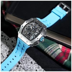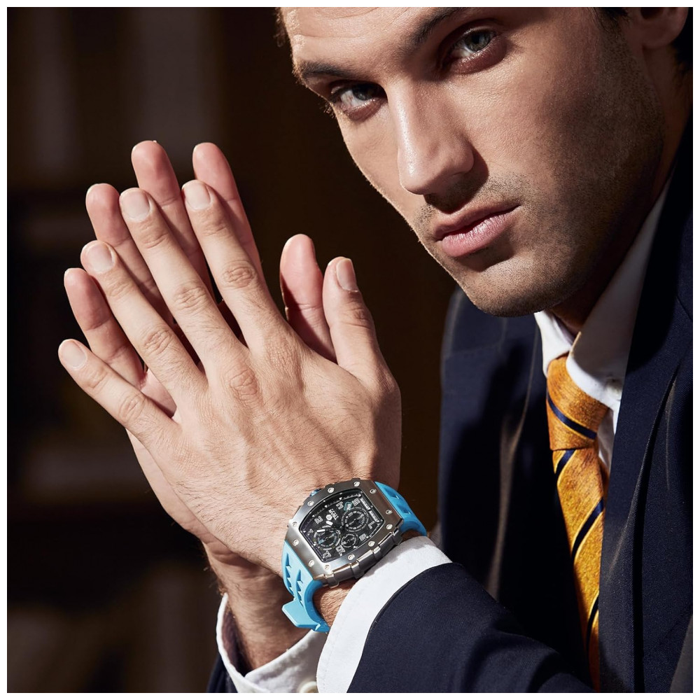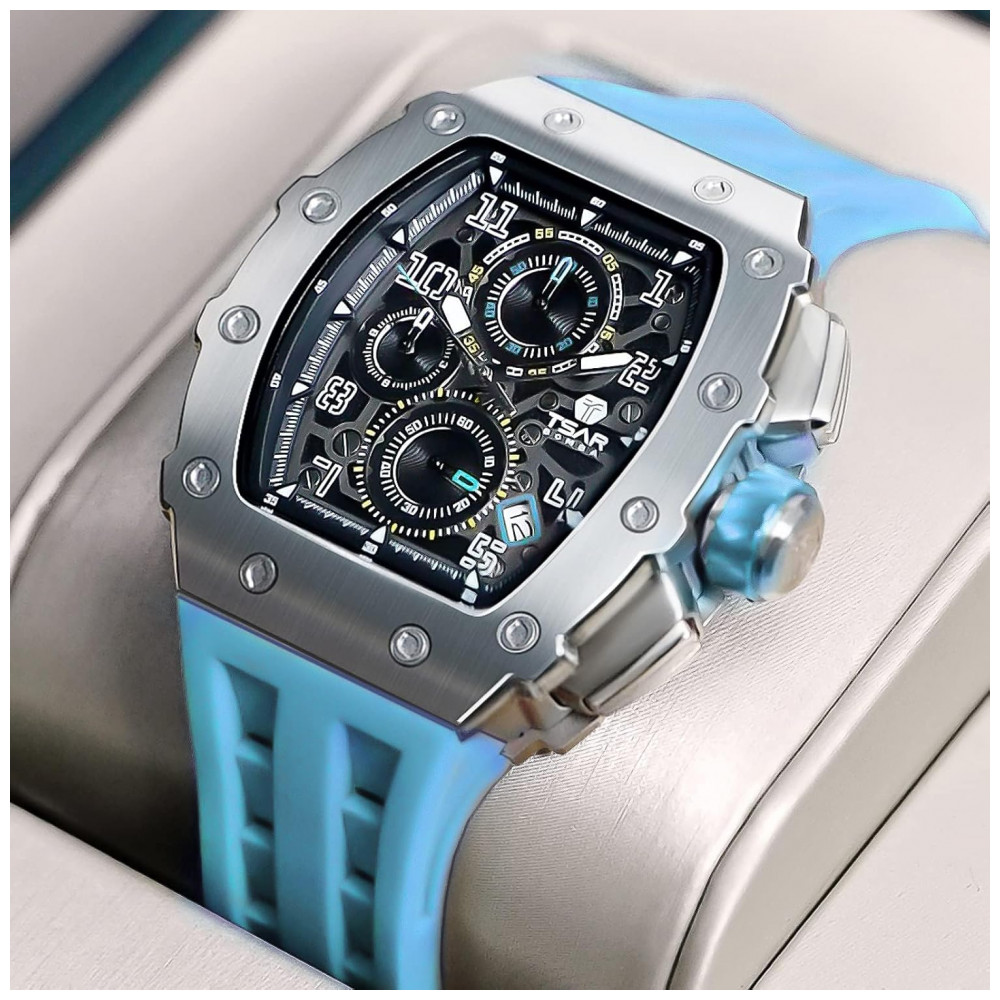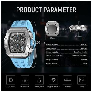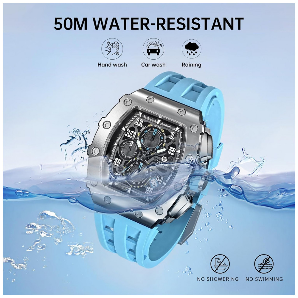 Descubra o requinte e a precisão do TSAR BOMBA, um relógio masculino projetado para quem valoriza estilo e funcionalidade. Perfeito para o dia a dia e ocasiões especiais, este relógio oferece resistência à água de até 50 metros, garantindo proteção contra respingos e imersões superficiais. Seu design tonneau luxuoso, combinado com uma pulseira de silicone confortável, traz um visual moderno e sofisticado, ideal para homens que buscam elegância sem abrir mão do conforto. Equipado com movimento de quartzo japonês, o TSAR BOMBA assegura máxima precisão e durabilidade. O mostrador em prata com detalhes azul claro destaca ainda mais a exclusividade deste modelo. Além disso, o cronógrafo integrado proporciona praticidade para medir intervalos de tempo com facilidade. Perfeito para presentear, este relógio é a combinação ideal entre tecnologia, estilo e robustez, tornando-se um acessório indispensável para homens dinâmicos e exigentes.