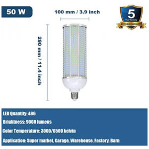 A lâmpada Ultra Bright 9000LM 50W LED Corn Bulb com base E26/E27 oferece iluminação potente e eficiente, sendo equivalente a uma lâmpada incandescente de 900 watts. Com temperatura de cor de 6000K (luz fria), é ideal para áreas amplas como galpões, oficinas, armazéns, ruas, jardins e garagens. Possui fluxo luminoso de aproximadamente 6000 lúmens, alto índice de reprodução de cores (CRI acima de 90), e ângulo de feixe de 360°, garantindo iluminação uniforme em todas as direções.