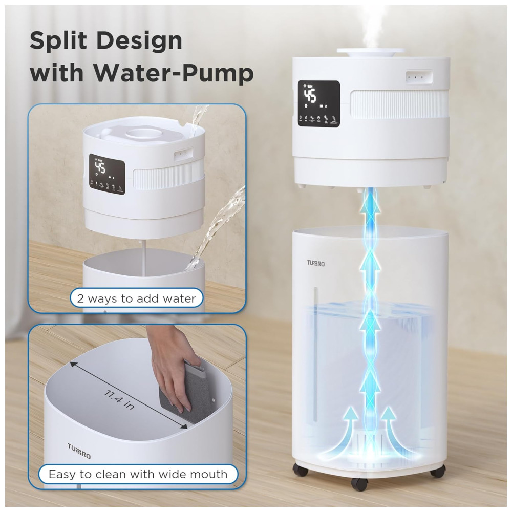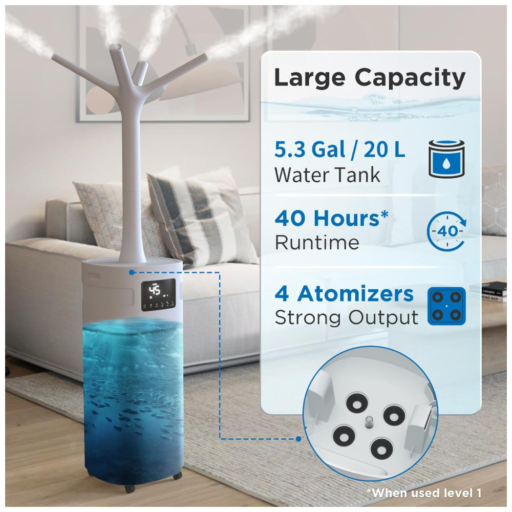 Com um tanque de água de 5,2 galões (20 litros), você pode desfrutar de até 25 a 40 horas de névoa contínua. Seu design dividido permite fácil adição de água pela parte superior, evitando vazamentos pela parte inferior.