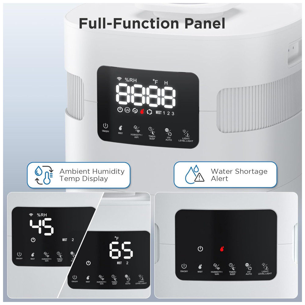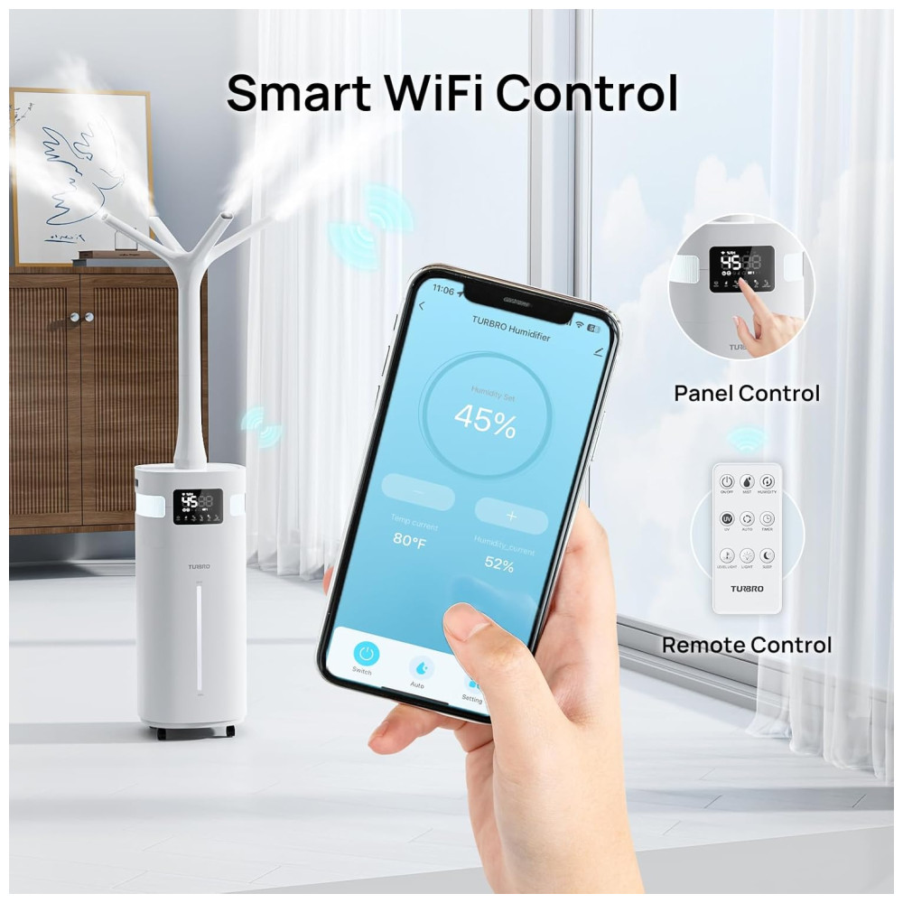 O umidificador pode ser controlado via aplicativo para smartphone, painel de funções completas ou controle remoto, oferecendo flexibilidade na operação. Com um visor que exibe a umidade e a temperatura ambiente, e um ventilador silencioso, o GLH20 é prático e não perturba o sono à noite.