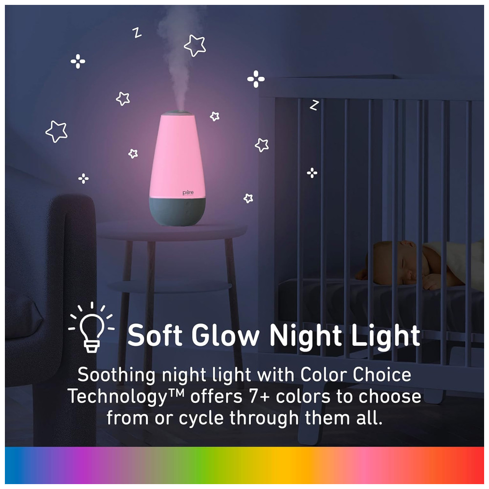 LUZ NOTURNA SOFT GLOW: Crie um ambiente relaxante girando através de uma variedade de cores do espectro do arco íris ou use nossa tecnologia de escolha de cores para exibir suavemente uma cor favorita em toda a sala. Use de forma independente ou em conjunto com a configuração de névoa para acalmar seu filho durante a hora da soneca ou de dormir, sem interrupções.