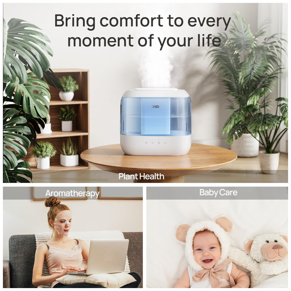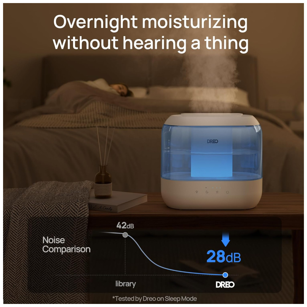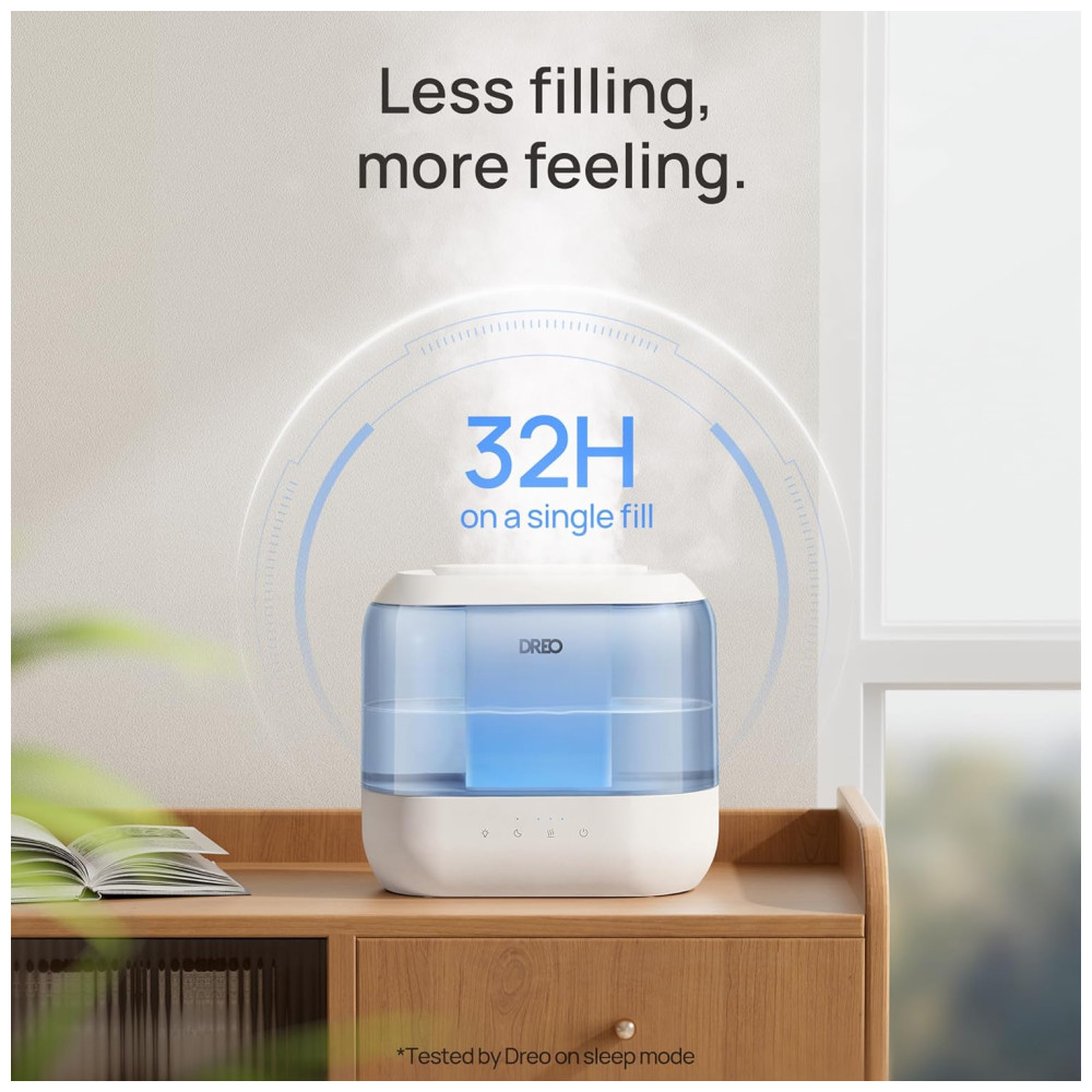 O umidificador ultrassônico Dreo foi desenvolvido para ambientes de até 28 m², combinando operação silenciosa de 28 dB, autonomia de até 36 horas e capacidade de 4 litros. Possui design Top Fill que facilita o abastecimento, evitando respingos, e permite limpeza rápida devido ao reservatório modular. O difusor de óleos essenciais embutido proporciona aromatização do ambiente (óleos não inclusos), aliado à luz noturna ajustável para criar diferentes atmosferas.