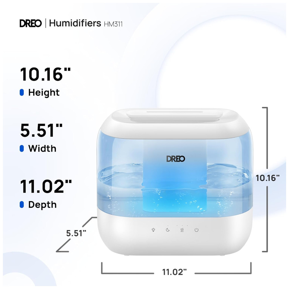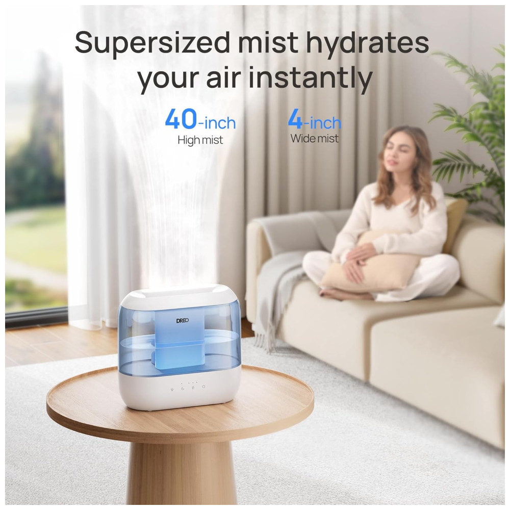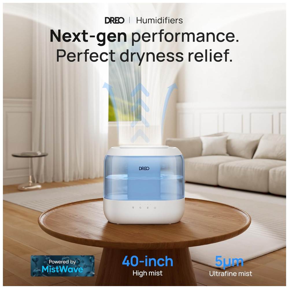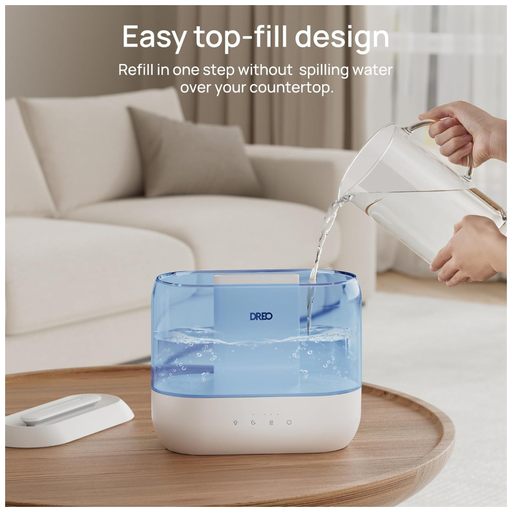 O umidificador ultrassônico Dreo foi desenvolvido para ambientes de até 28 m², combinando operação silenciosa de 28 dB, autonomia de até 36 horas e capacidade de 4 litros. Possui design Top Fill que facilita o abastecimento, evitando respingos, e permite limpeza rápida devido ao reservatório modular. O difusor de óleos essenciais embutido proporciona aromatização do ambiente (óleos não inclusos), aliado à luz noturna ajustável para criar diferentes atmosferas.