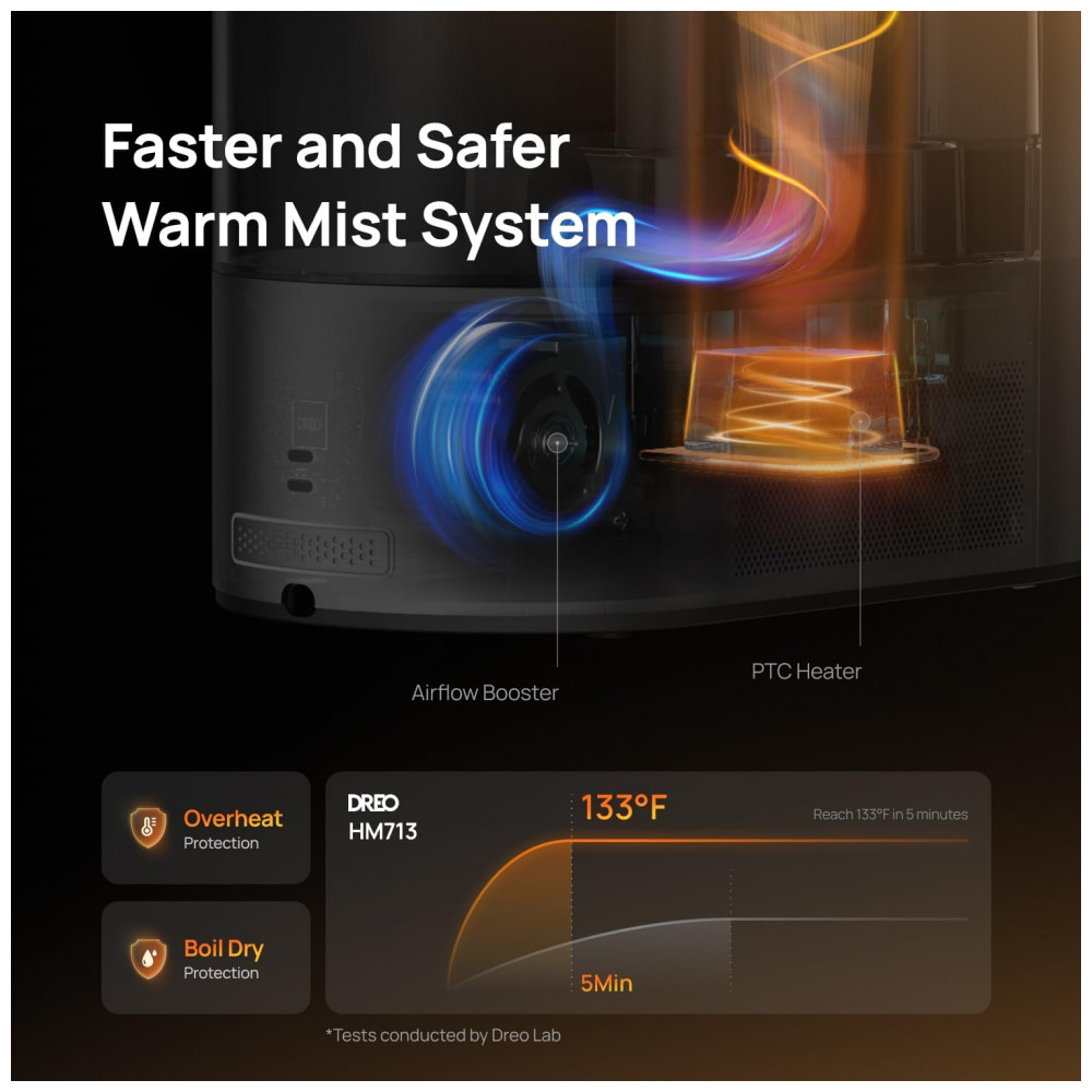 A Solução Umidificante Ultimate: O Umidificador Dreo HM713 traz uma humidificação super rápida de 500mL, hr com névoa quente mais rápida 30 graus C em apenas 5 minutos para alívio instantâneo da secura. Graças à tecnologia de umidificação ultrassônica MistWave, este umidificador silencioso de 28dB para casa cria uma névoa alta de 109 centímetros com partículas mais finas que espalham a umidade uniformemente em qualquer sala que você a usa, enquanto seu tanque de 6L garante um tempo de execução mais longo para umidificar por dias.
