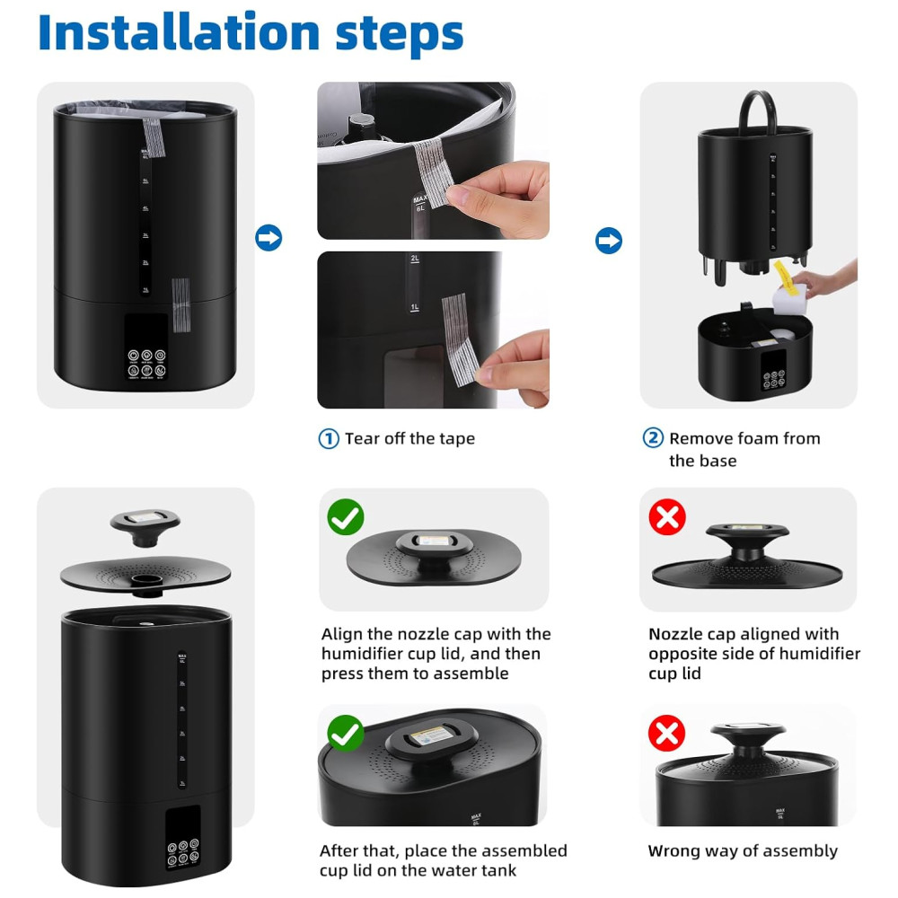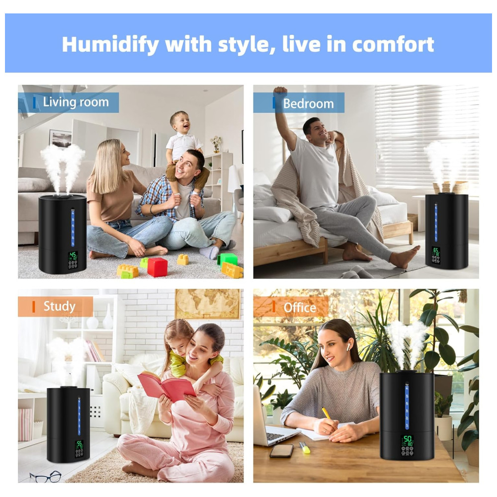 Aproveite os benefícios do umidificador de névoa quente e fria da Coolfiqu, que oferece opções de névoa quente e fria com um simples toque. A névoa fria melhora a qualidade do ar seco para um sono melhor, enquanto a névoa quente é ideal para hidratar a pele e aliviar desconfortos. Com design Top Fill, o processo de recarga se torna mais prático, permitindo que você despeje água diretamente no tanque. Com capacidade de 6L, é perfeito para quartos, salas grandes, escritórios, viveiros e plantas internas. Funciona por até 60 horas por recarga, ideal para casas grandes, proporcionando um ambiente tranquilo e confortável. Com bicos giratórios de 360 graus para dispersar a névoa em qualquer direção, mantendo a umidade equilibrada. Possui 3 níveis de ajuste de névoa, sensor inteligente para regular a umidade, modo silencioso para um sono tranquilo, função antidry burn para segurança e difusor de óleos essenciais. Surpreenda-se com este umidificador.