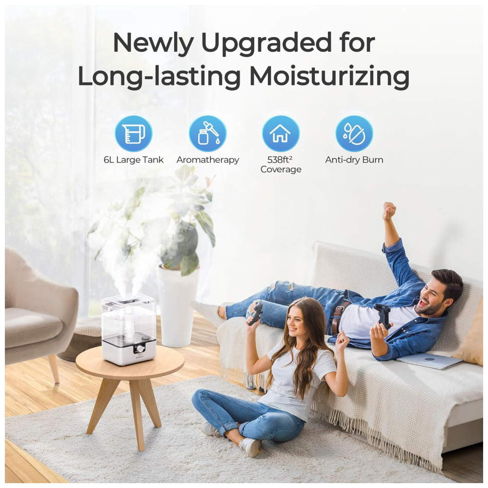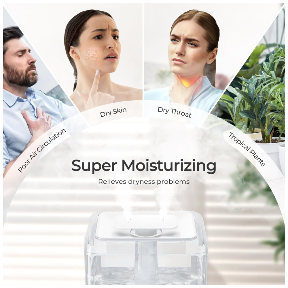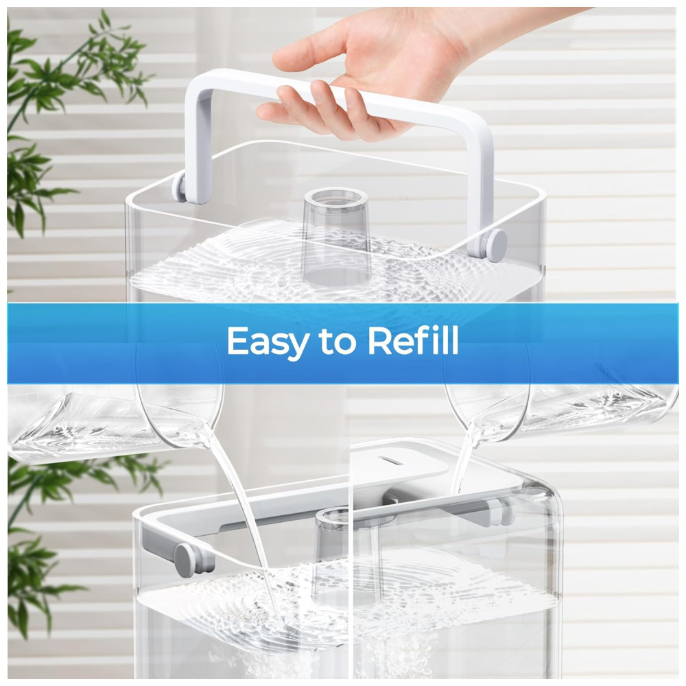 Um indicador luminoso vermelho acende quando é hora de reabastecer a água, e o umidificador desliga automaticamente quando o nível da água está muito baixo, garantindo segurança e eficiência. Com uma saída de névoa fria ultrafina de até 300 ml/h, ele rapidamente adiciona umidade ao ar em salas grandes, ajudando a aliviar congestão, tosse e pele seca.