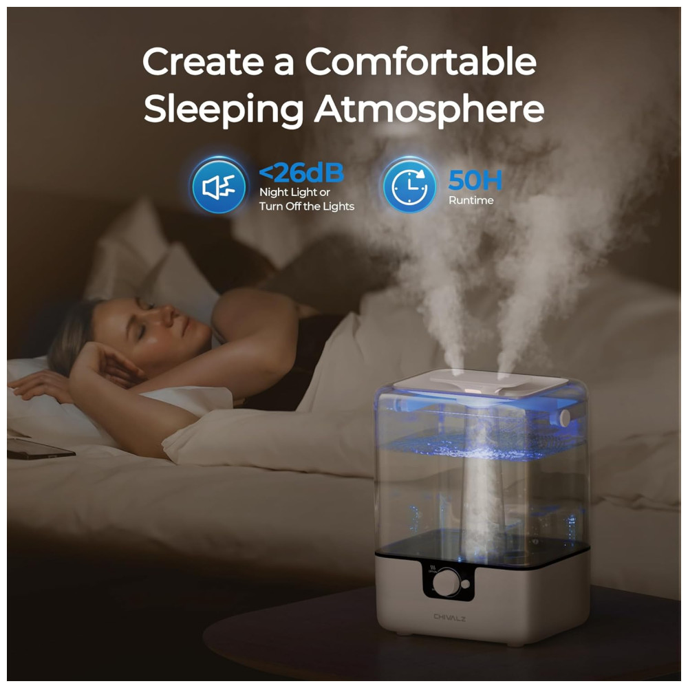 O umidificador CHIVALZ opera de forma silenciosa, com um nível de ruído a partir de 26,0 dB na configuração mais baixa, permitindo uma noite de sono tranquila. Além disso, as luzes noturnas azuis suaves podem ser ajustadas conforme sua preferência, podendo ser ligadas ou desligadas.