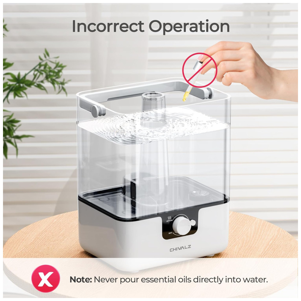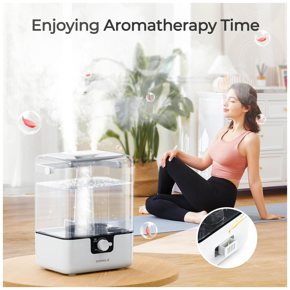 O umidificador CHIVALZ é um equipamento 2 em 1 que atua como um umidificador e difusor, projetado para melhorar a qualidade do ar em sua casa. Com um tanque de água de 6 litros, ele pode funcionar por até 50 horas com um único abastecimento. Para melhores resultados e benefícios à saúde, recomenda-se o uso de água destilada ou purificada.