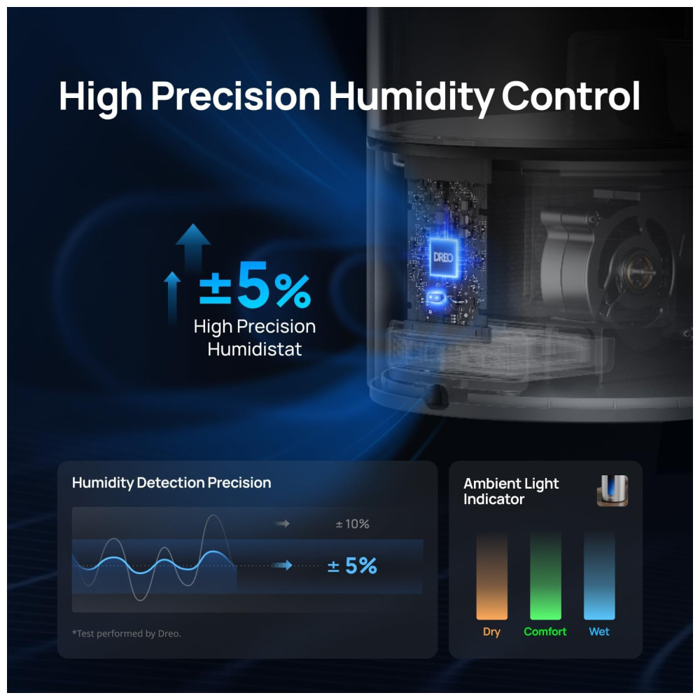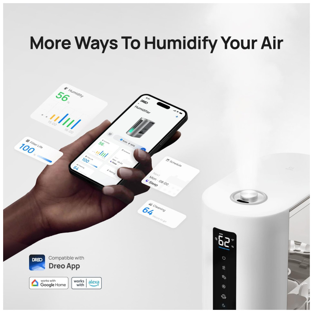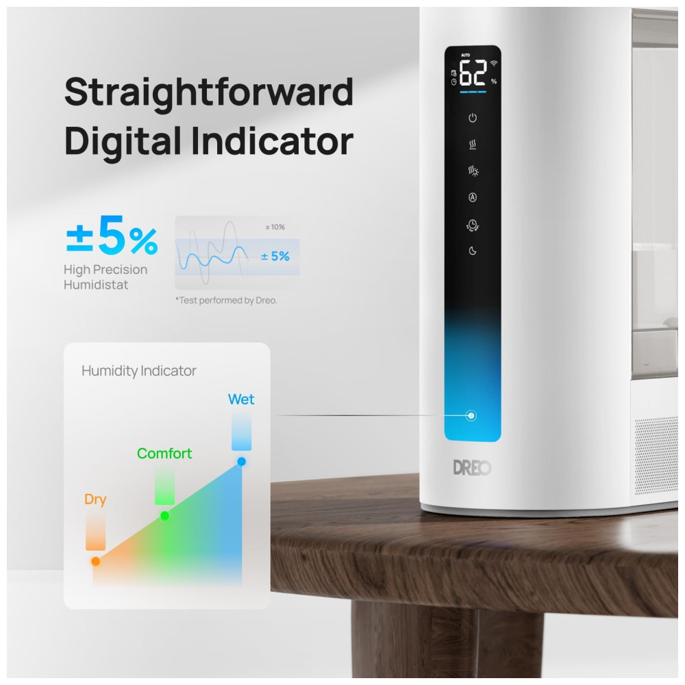 Descubra a solução definitiva para umidificar o ar com o umidificador Dreo HM713S para quartos. Este umidificador oferece uma rápida humidificação de 500mL/hr com neblina quente em apenas 5 minutos, proporcionando alívio imediato para o ressecamento. Graças à tecnologia MistWave, este umidificador Warm Cool mist para ambientes grandes cria uma neblina , com partículas mais finas que espalham a umidade de forma uniforme por qualquer cômodo. Com um tanque de 6L, garante longas horas de funcionamento para dias de umidificação. Controle preciso da umidade do ambiente: o umidificador inteligente de 6L para plantas permite que você ajuste com precisão a umidade desejada, com uma tolerância de 5%, duas vezes mais preciso do que os umidificadores tradicionais. Seu indicador de umidade facilita a verificação da umidade do ambiente de longe. Três modos em um toque: este umidificador para ambientes grandes oferece três modos para personalizar a umidade de acordo com seu estilo de vida. No modo Manual, você pode escolher entre 3 níveis de neblina. No modo Automático, é possível definir a umidade desejada entre 30 e 90. E no modo Sono, a luz é desligada automaticamente e o ruído é reduzido para uma noite de sono tranquila. Aplicativo Dreo inteligente e conveniente: manter o ar fresco e saudável ficou muito mais fácil. Acompanhe em tempo real a umidade, monitore os níveis por até 30 dias, receba lembretes inteligentes de limpeza personalizados. Bandeja dualaroma: mude o ambiente com facilidade graças ao design da bandeja dualaroma. Com este umidificador ultrassônico com difusor de óleo, basta movimentar a tampa da bandeja de aroma para alternar entre fragrâncias ao longo do dia. Tanque pronto para cartuchos: os umidificadores Dreo apresentam um design versátil de tanque, perfeito para uso com cartuchos para melhorar o desempenho ou para funcionar sem eles. Pronto para levar para o próximo nível? Procure pelo Cartucho de Desmineralização Dreo para adquirir novos cartuchos.