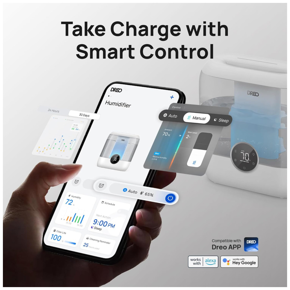 O Umidificador Inteligente da Dreo é perfeito para manter o ambiente da sua casa sempre saudável e confortável. Com um sensor de última geração que monitora a umidade com precisão, você pode definir o nível de conforto desejado e deixar que o sensor ajuste automaticamente o umidificador. O modo automático garante um ar equilibrado, enquanto o aplicativo permite personalizar a iluminação com base na umidade. Com capacidade de 6 litros, ele garante até 60 horas de umidificação contínua no modo sono, sendo ideal para quartos, plantas, bebês e animais de estimação. Seu design de preenchimento superior facilita as recargas, garantindo conforto ininterrupto. Além disso, com seu funcionamento ultra silencioso de 28 dB, você terá noites tranquilas e agradáveis. Aproveite para adicionar seus óleos essenciais favoritos, criar um ambiente de spa e escolher entre as configurações de luz relaxante. Com diversas funcionalidades, como monitoramento em tempo real da umidade, diferentes níveis de névoa e timer de até 12 horas, este umidificador oferece conforto sem interrupções dia e noite. A limpeza é simples graças ao design modular, e um cartucho opcional de descalcificação ajuda a manter a qualidade da névoa. O dispositivo também emite um alerta quando o cartucho precisa ser substituído, garantindo ar fresco o ano todo.Contacte-nos caso queira comprar o cartucho.