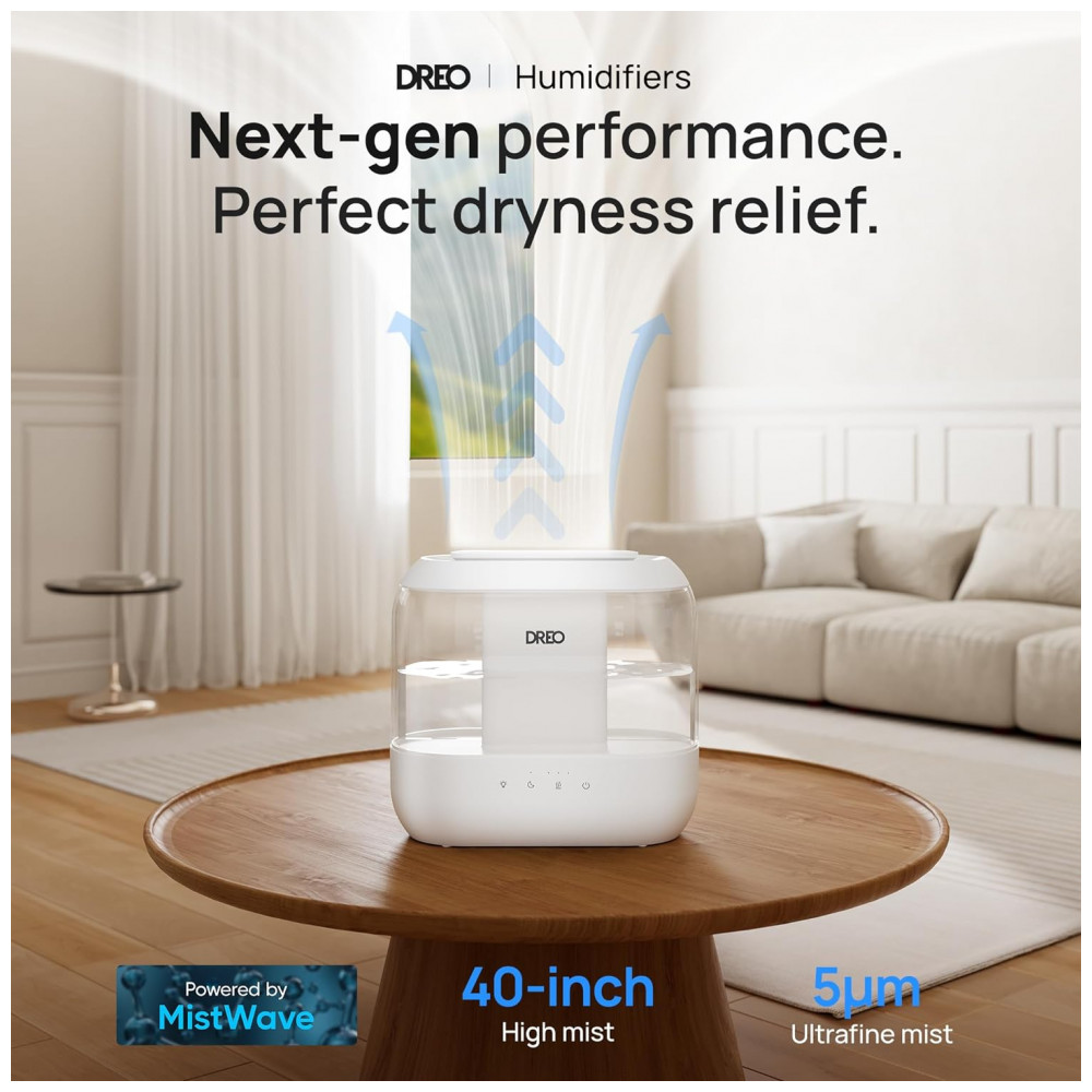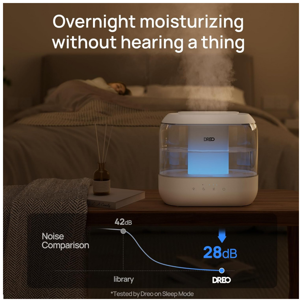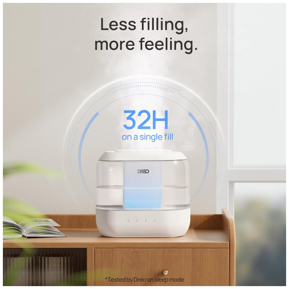 O Umidificador Dreo HM311 oferece operação ultrassilenciosa (28 dB), tanque superior de 4 litros com abastecimento facilitado e autonomia de até 36 horas sem reabastecimento, indicado para quartos, bebês, escritórios e ambientes até 28 m². A atomização ultrassônica libera névoa fina de 5 μm, proporcionando umidificação uniforme sem molhar superfícies. Possui difusor de aromas, luz noturna ambiente e controle digital por toque. Design modular facilita remoção, montagem e limpeza completa. Compatível com cartuchos de desmineralização ou clean mist (não inclusos), prevenindo poeira branca e melhorando a saúde da névoa. Todos os plásticos são BPA free, adequados para uso em quarto infantil. Acompanha escova de limpeza, manual e pad de aroma.
