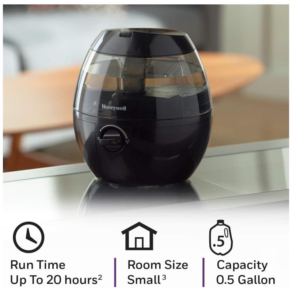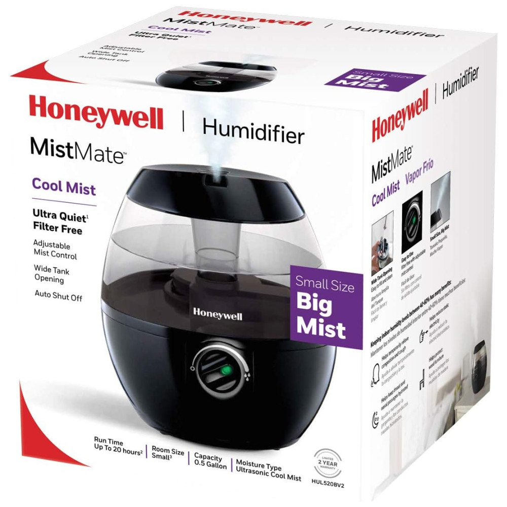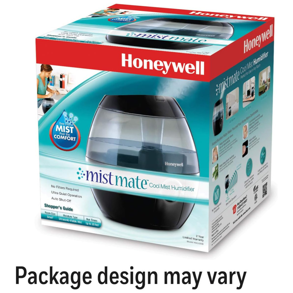 O Honeywell HUL520B Mistmate é um umidificador ultrassônico portátil, ideal para ambientes pequenos como quartos, escritórios ou berçários. Possui tanque de 1,9 litros (0,5 galão), abastecimento superior facilitado e funcionamento super silencioso com controle manual de intensidade de névoa. Oferece operação contínua de até 20 horas por enchimento, desligamento automático ao atingir baixo nível de água e não utiliza filtro. Seu design compacto e arredondado permite posicionamento em mesas ou criados-mudos, ajudando a aliviar pele seca, sintomas de alergia e ressecamento do ambiente. Fabricado em plástico preto resistente, é fácil de limpar, atende controle touch e não requer manutenção complexa.