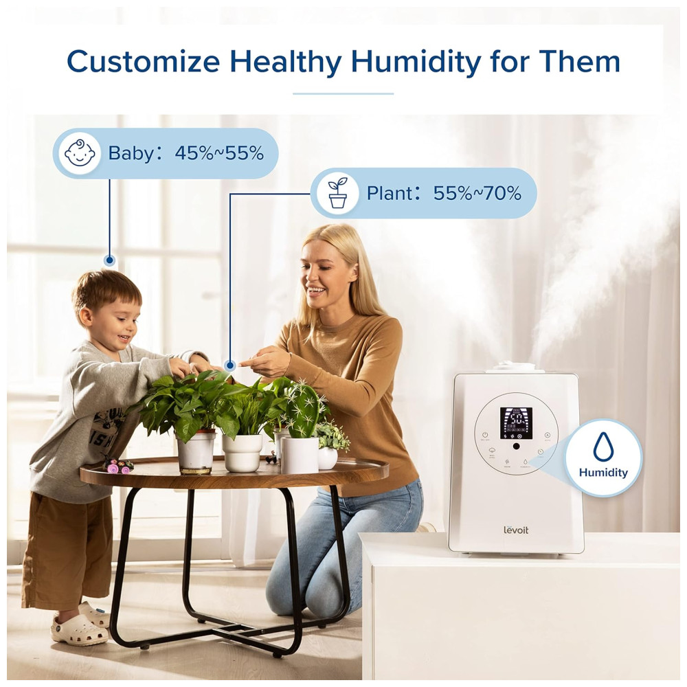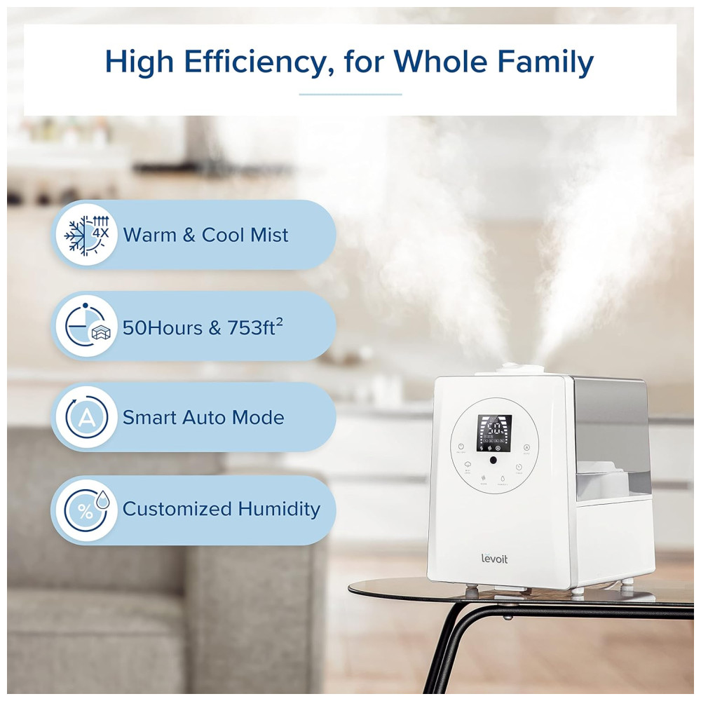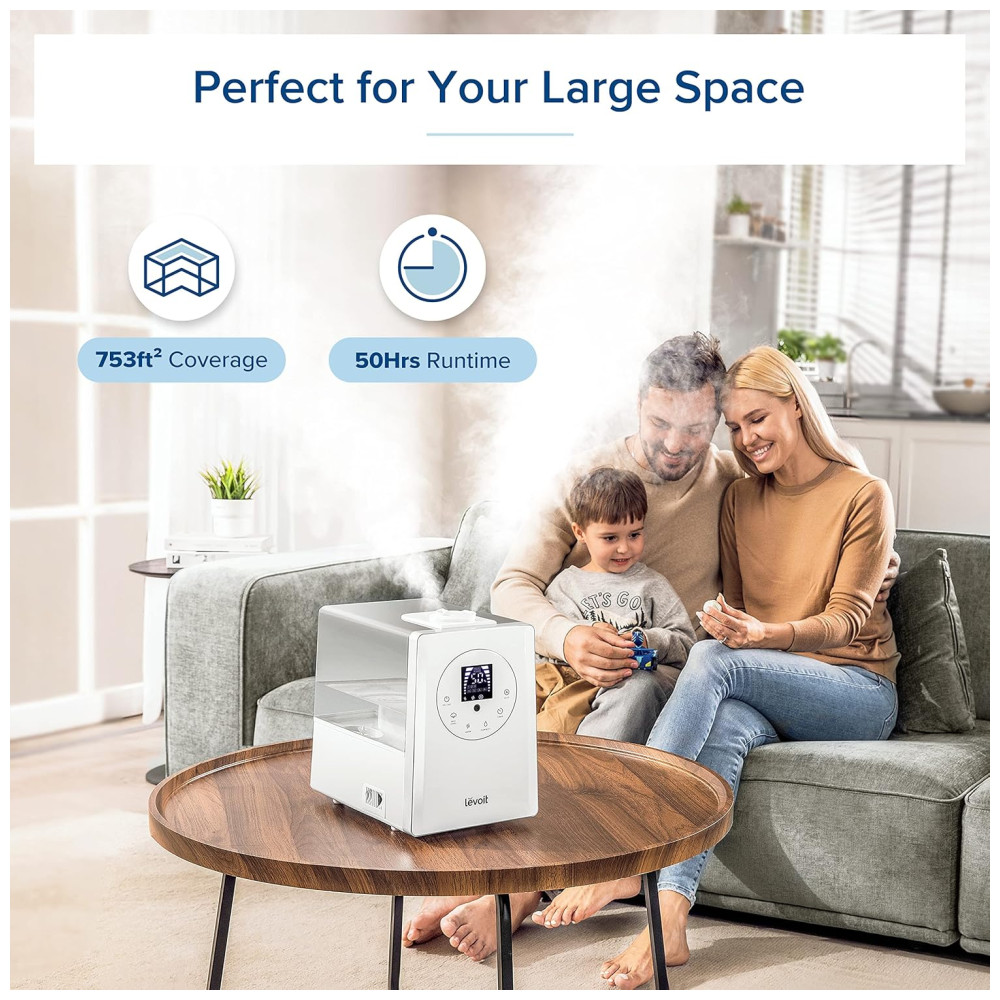 Perfeito para salas grandes com uma saída de névoa de até 500 mL , h, o LV600HH pode facilmente lidar com espaços tão grandes quanto 753 pés2 , 70 m2. A grande capacidade de 1,5 gal , 6 L permite 60 horas de uso contínuo com baixo nível de névoa.