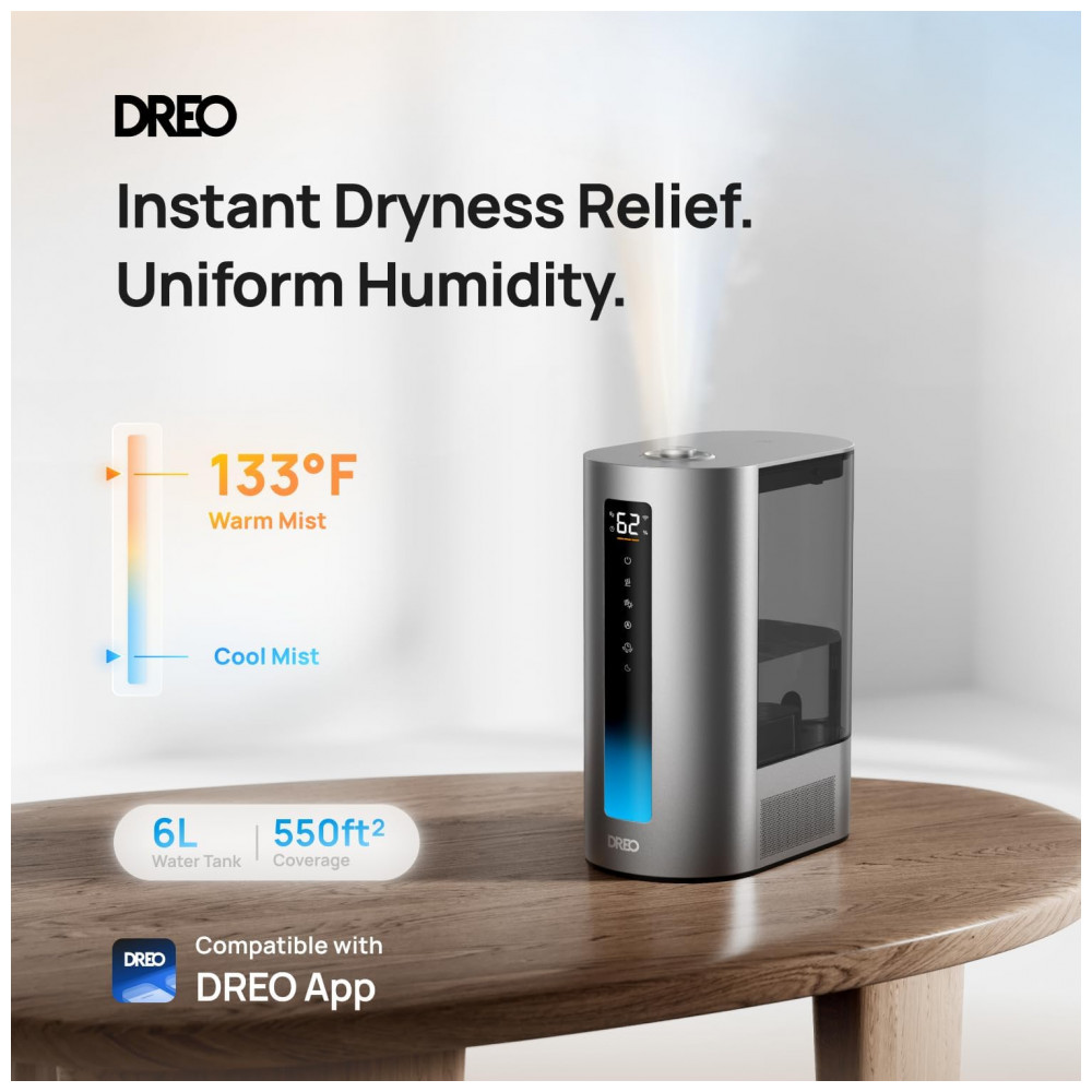 A solução de umidificação definitiva: O umidificador Dreo HM713S traz umidificação super rápida de 500mL, h com névoa quente mais rápida 30 graus C em apenas 5 minutos para alívio instantâneo da secura. Graças à tecnologia de umidificação MistWave, este umidificador para casa cria uma névoa de 109 centímetros de altura com partículas mais finas que espalham a umidade uniformemente em qualquer ambiente em que você o usa, enquanto seu tanque de 6L garante um tempo de umidificação mais longo por dias.