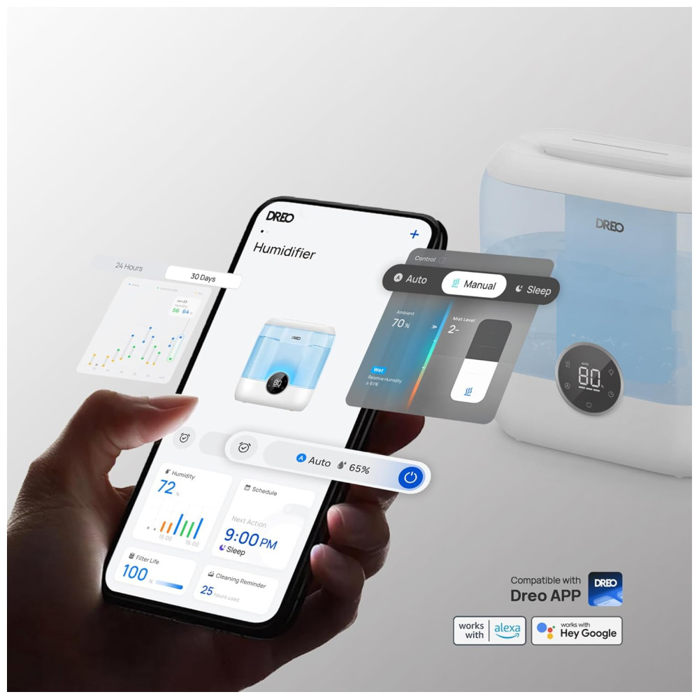 Ajuste o nível de conforto ideal e deixe o sensor de última geração assumir o controle. O modo automático ajusta seu umidificador de ar para manter o equilíbrio, enquanto o aplicativo permite personalizar a iluminação com base na umidade. Use o aplicativo Dreo, comandos de voz ou Alexa para gerenciar remotamente seu umidificador de ar, monitorando facilmente a umidade interna. Com design de preenchimento superior, o umidificador para quarto possui um grande tanque de água de 6L, proporcionando até 60 horas de umidificação contínua. Operando silenciosamente a apenas 28 dB, é perfeito para bebês e garante uma noite tranquila. Com três níveis de névoa, a direção ajustável de 15 bocais garante a distribuição exata da névoa. Além disso, o timer de 0 a 12 horas garante conforto ininterrupto, dia e noite. O design modular facilita a limpeza, com opção de cartucho para descalcificação e limpeza do cartucho de névoa. A luz de ícone notifica quando o cartucho precisa ser trocado, garantindo ar fresco o ano todo.Contacte-nos caso queira comprar o cartucho.