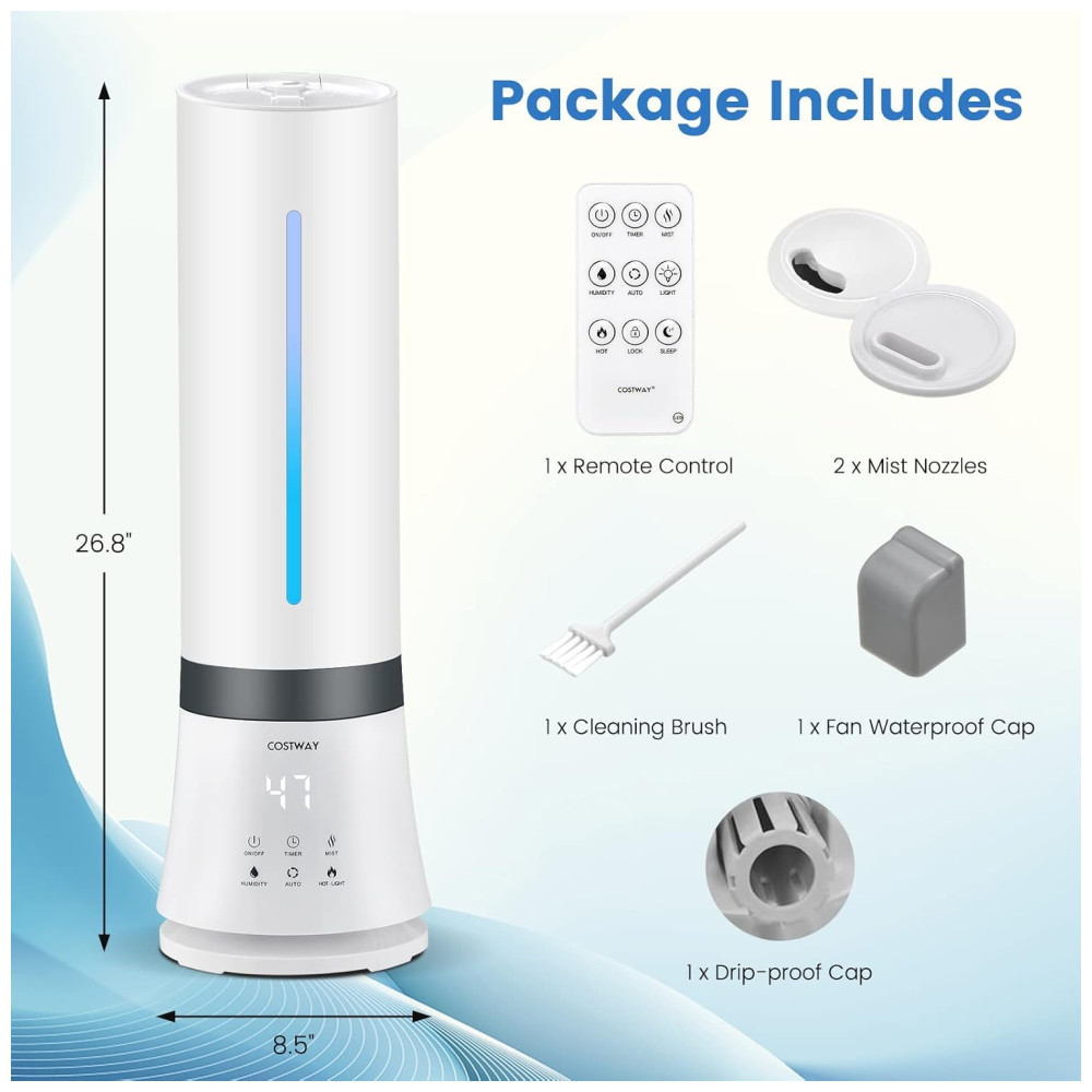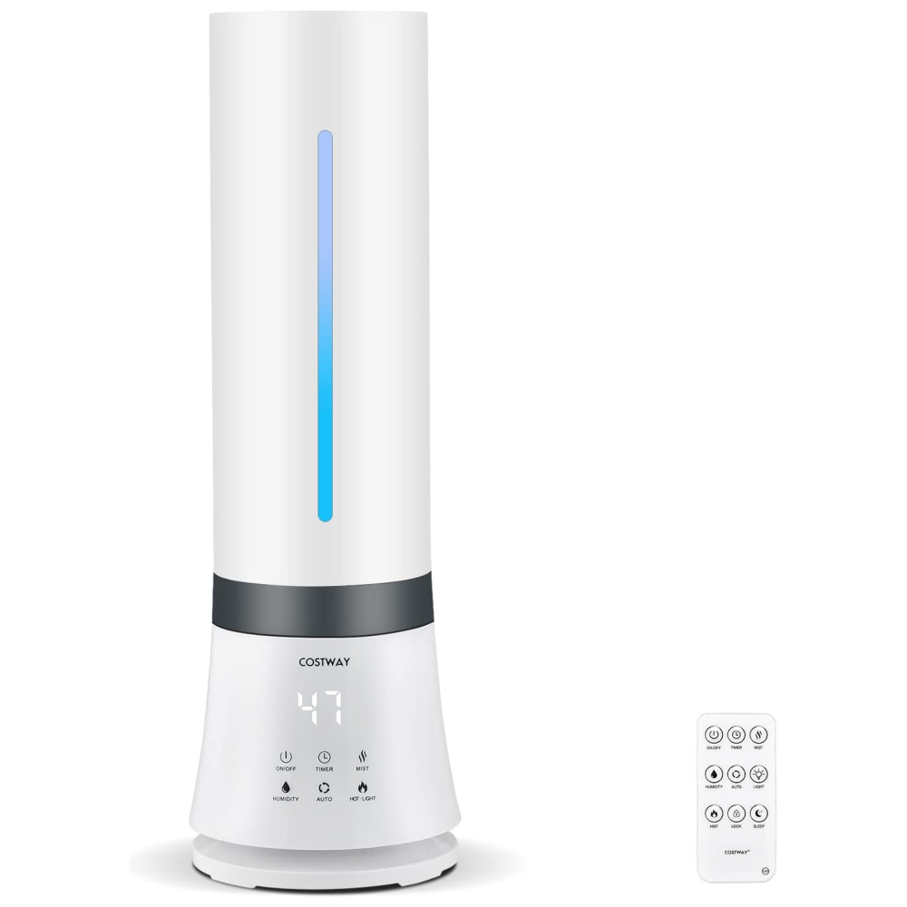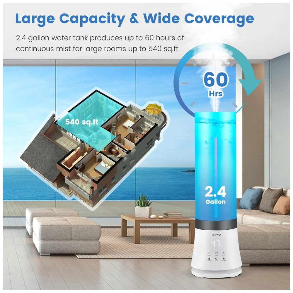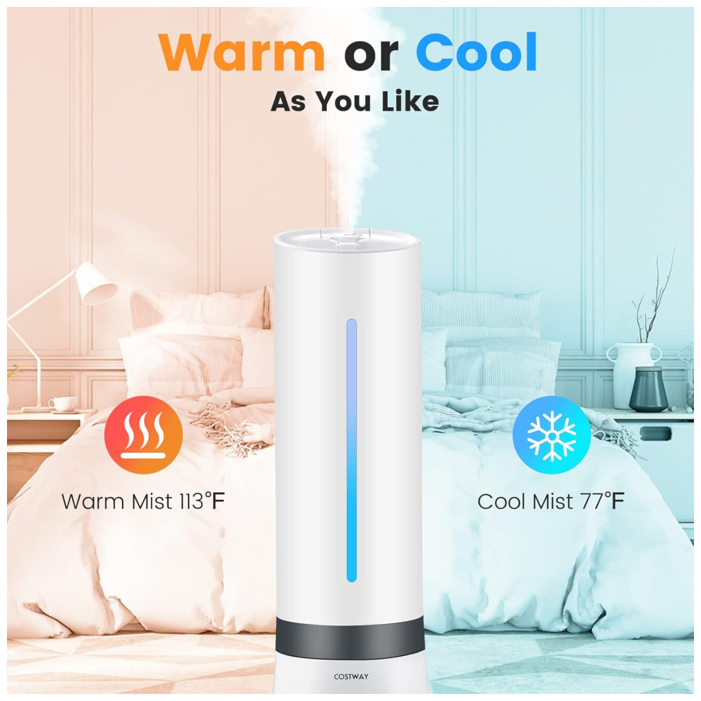Umidificador névoa Quente e Fria 9L com Enchimento Superior Sensor de Umidade Luz Noturna Temporizador de 12H Controle Remoto e Modo de Espera para Ambientes até 50m² 110V 105W COSTWAY Branco