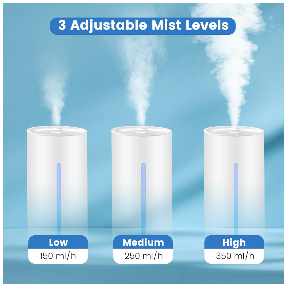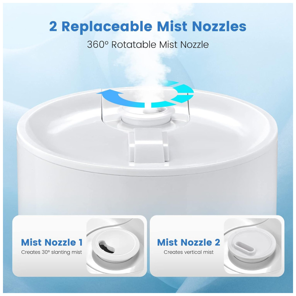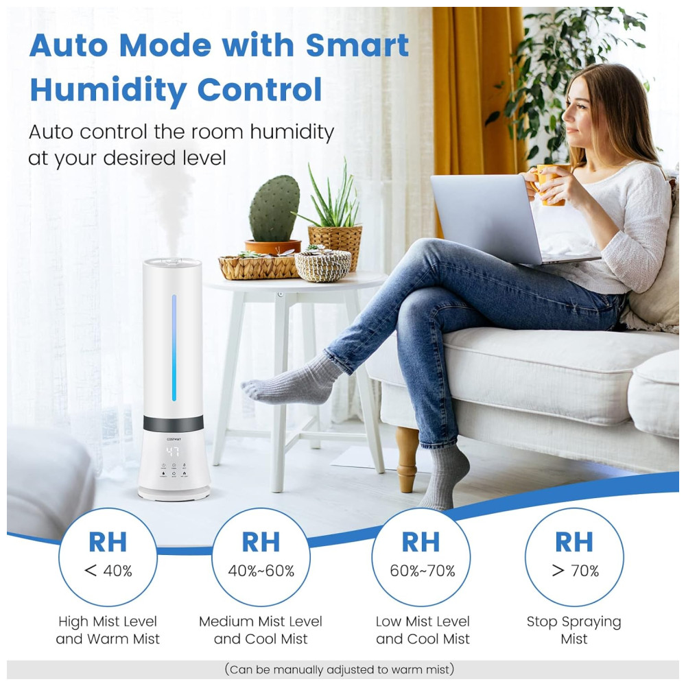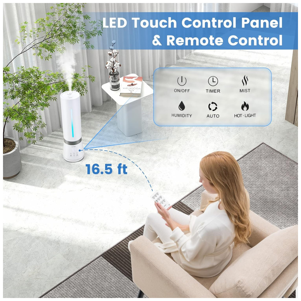 Capaz de produzir névoa quente ou fria em 3 níveis diferentes, o umidificador conta com um grande tanque de 2,4 galões (9 litros), oferecendo até 60 horas de autonomia. Seu design compacto e fino permite que ele se encaixe facilmente em qualquer canto da sala, sendo perfeito para quartos, escritórios e ambientes infantis.
