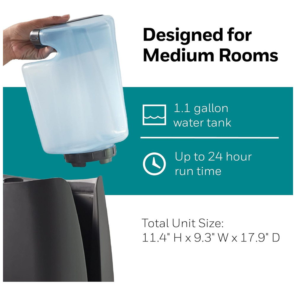 FÁCIL DE USAR Com um tanque grande de 3 litros, fácil de encher e autônomo, este umidificador de umidade fresco fornece até 24 horas de tempo de execução. Além disso, é fácil limpar, todas as peças que tocam na água podem ser limpas na máquina de lavar louça.