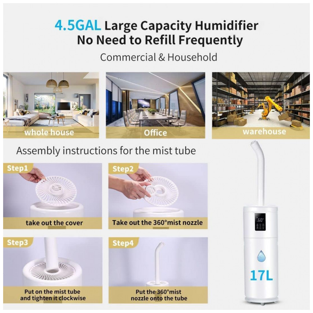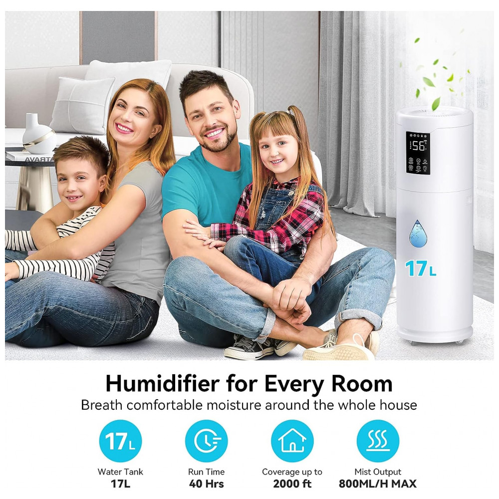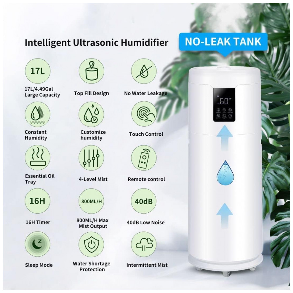 Umidificadores de grande capacidade 17L para uso doméstico e . Umidistato de 4 velocidades baixo, médio, alto, mais alto. Névoa constante 21 horas, máximo 800ml, h e Névoa intermitente 1M 3M 5M. O filtro de pedra cerâmica integrado elimina a necessidade de substituir os filtros semanalmente.