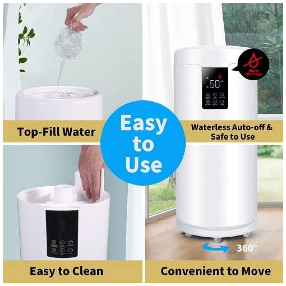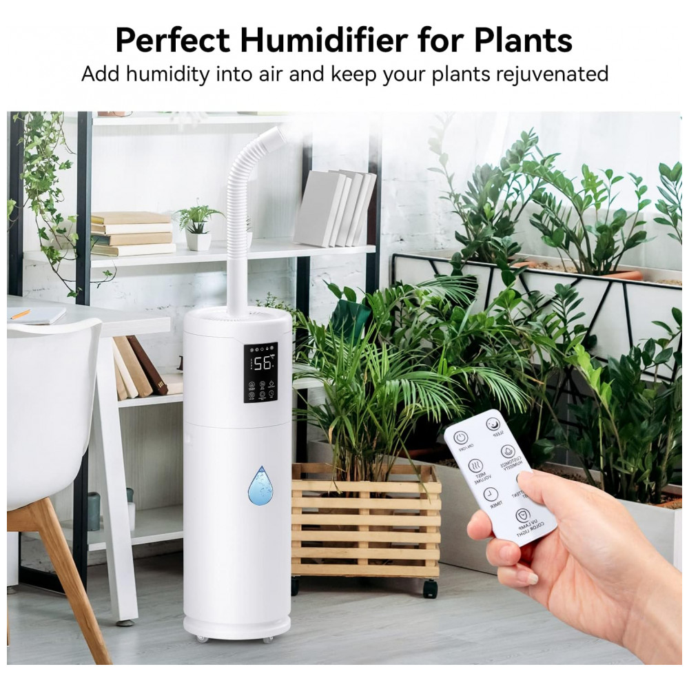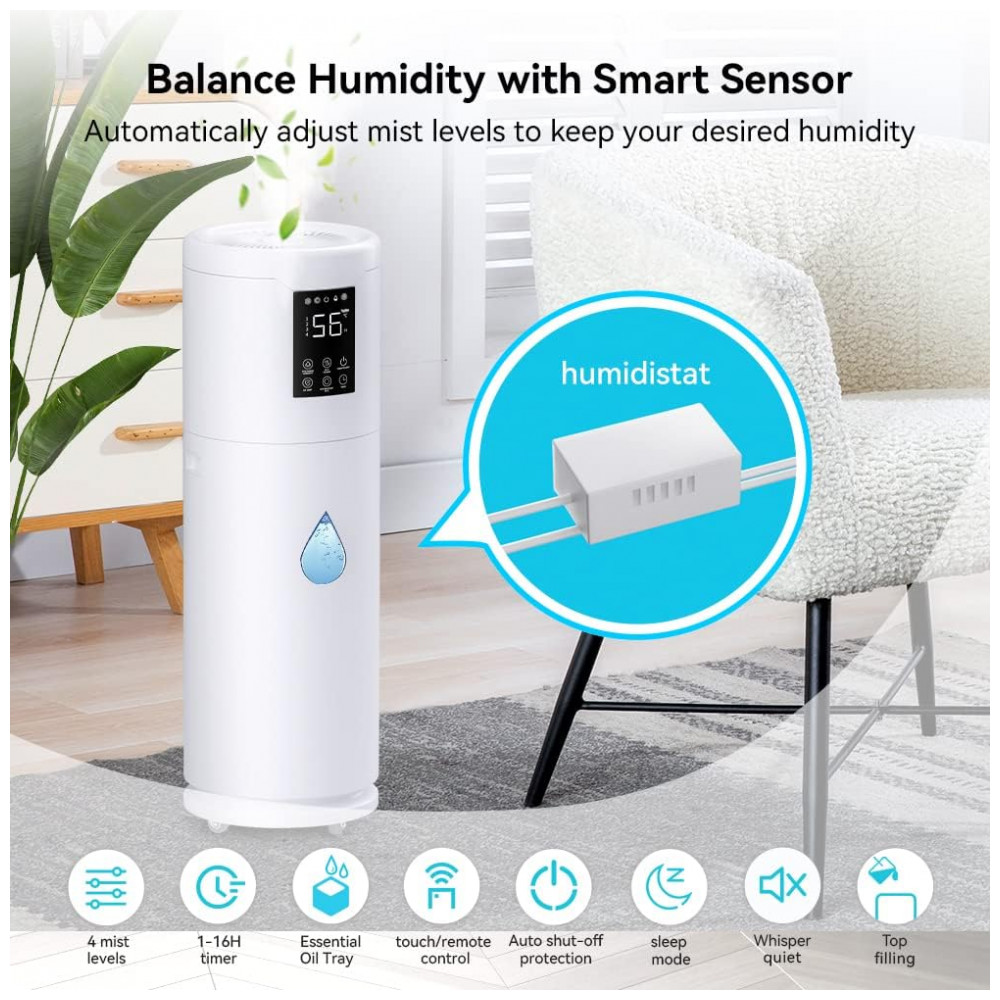 Umidificador para salas grandes em casa, cobrindo até 2.000 pés quadrados. Personalize a umidade de 45 a 95 ajuste de 5 por toque. O sensor umidistato integrado monitora e detecta o valor da umidade ambiente erro 5. Funciona em quartos pequenos também. Oferece umidade constante por mais de 40 horas durante a estação seca. Umidificador digital para toda a casa.