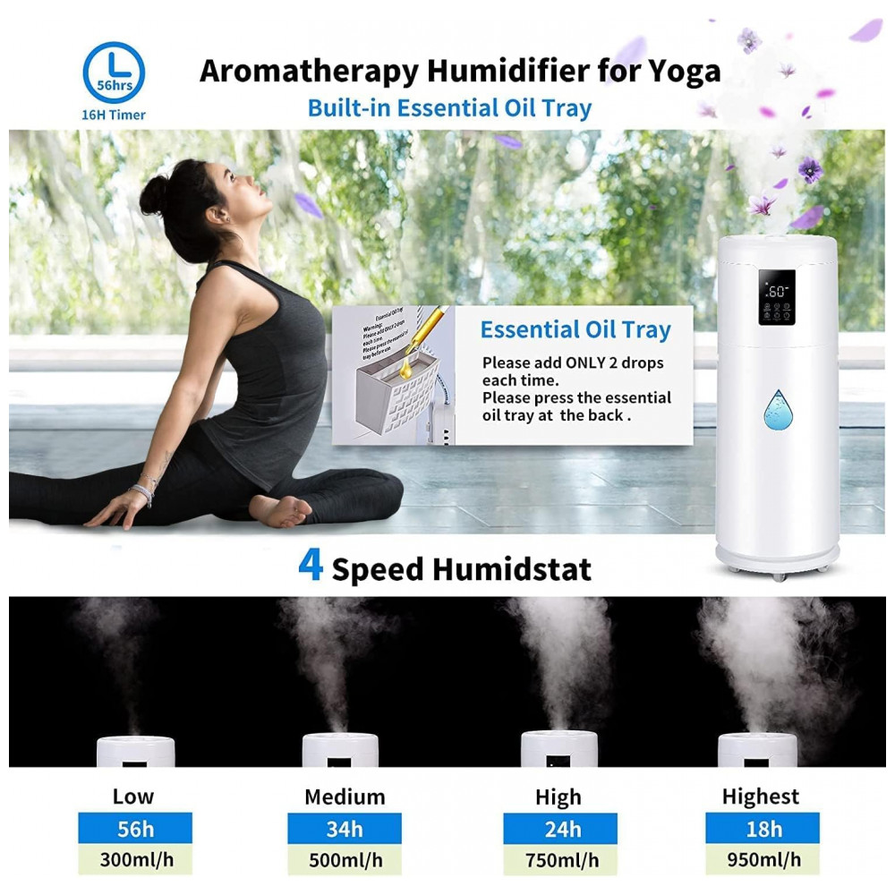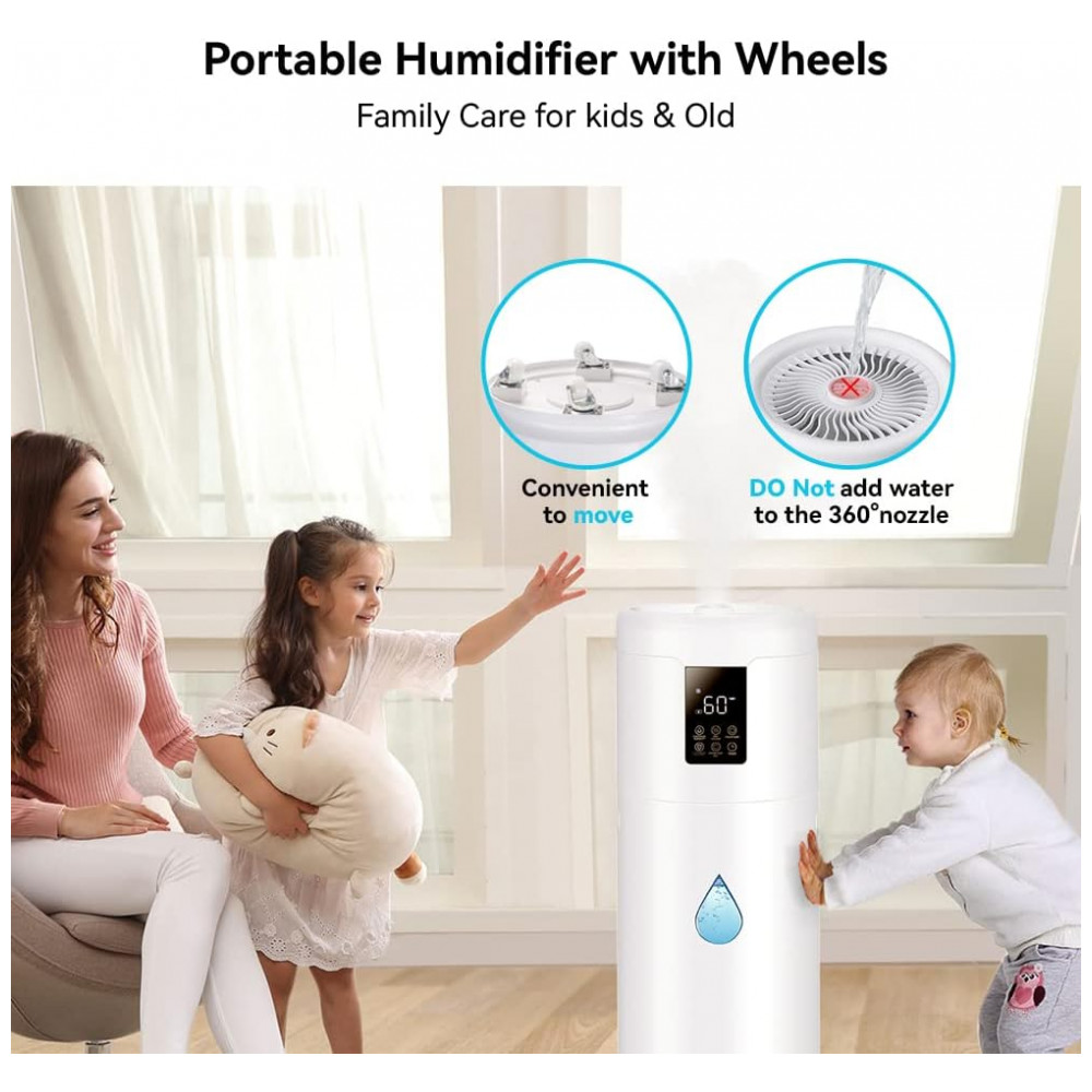 Umidificador portátil com 4 rodas, temporizador de 16 horas e controle remoto de 40dB. Alcance de 6 metros e controle sensível ao toque. As 4 rodas na parte inferior facilitam o deslocamento para qualquer lugar desejado. Ótimo para cuidar de crianças, idosos ou pessoas doentes em casa.
