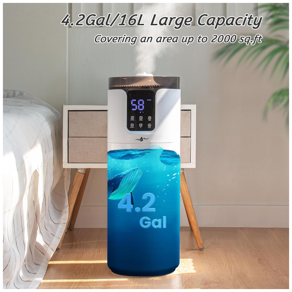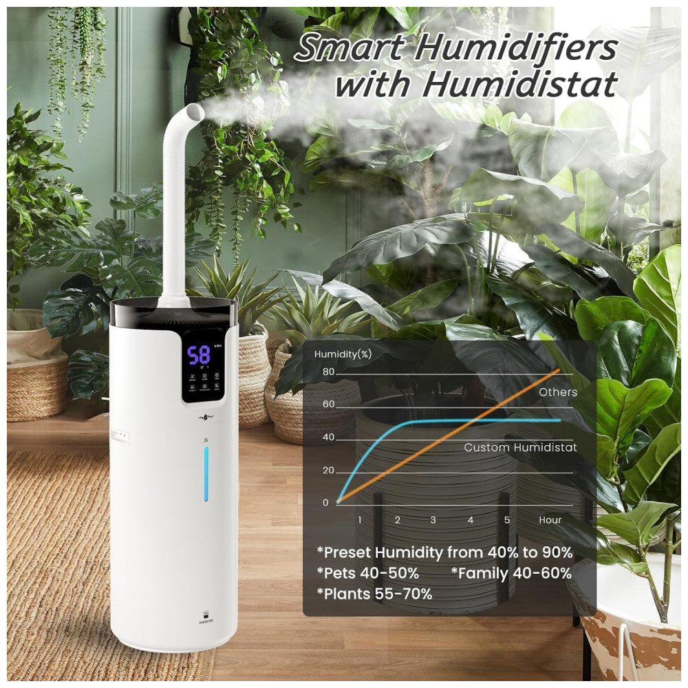 Umidificador Wholehouse para quartos grandes O grande umidificador com capacidade de água de 16L 4.2Galons pode produzir saída de névoa de até 1000mL, h pode cobrir a área de até 90 m2. Tubo livre ajustável livremente para seu uso múltiplo, como cultivo e hidratação de plantas e vegetais. Observação na primeira vez de usar, retire o guia do usuário e todos os acessórios do fundo do tanque.