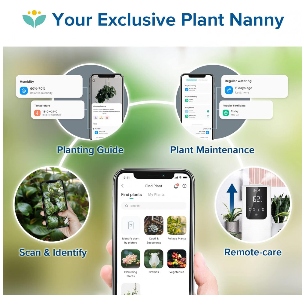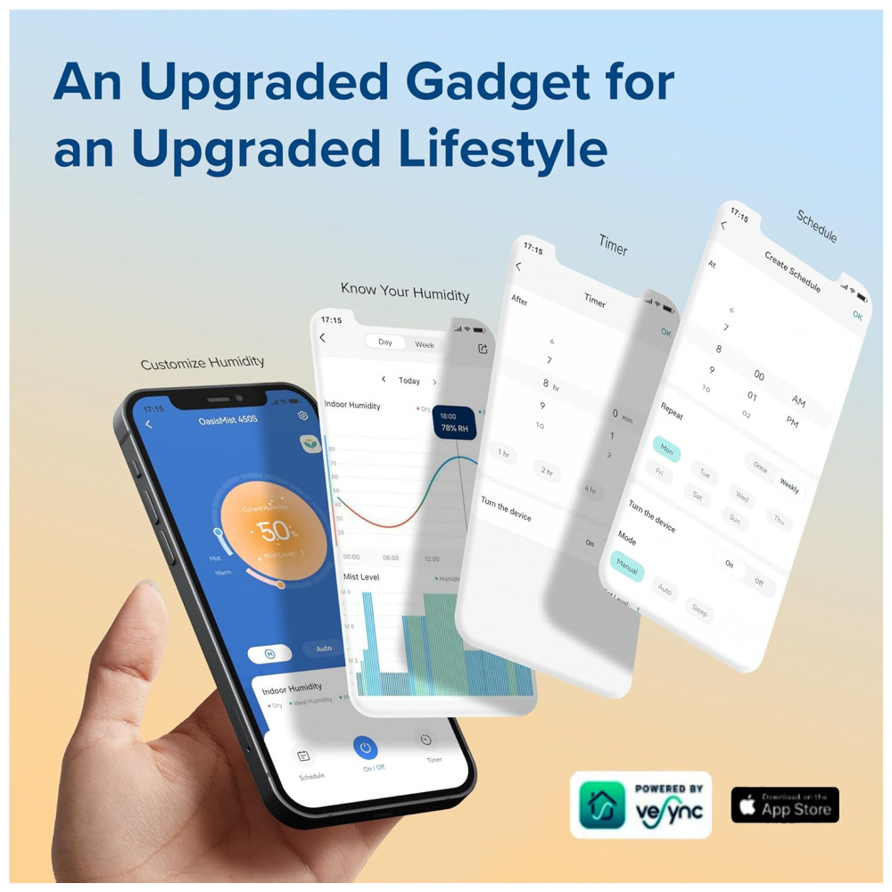 Oásis mais inteligente use o aplicativo gratuito VeSync para ligar, desligar remotamente, programar temporizadores e personalizar o ambiente de tratamento de plantas. Crie o seu oásis em casa com o smart OasisMist.