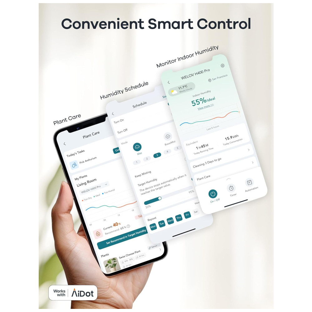 O AiDot é um umidificador de ambiente inteligente que oferece controle de voz através do aplicativo Smart AiDot. Com ele, você pode definir a umidade alvo, monitorar as condições em tempo real e programar o dispositivo. Compatível com Alexa e Google Home, proporciona uma experiência totalmente hands-free.