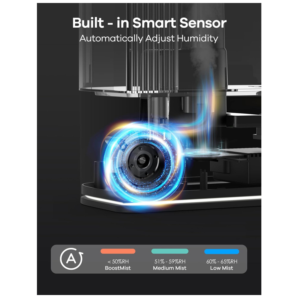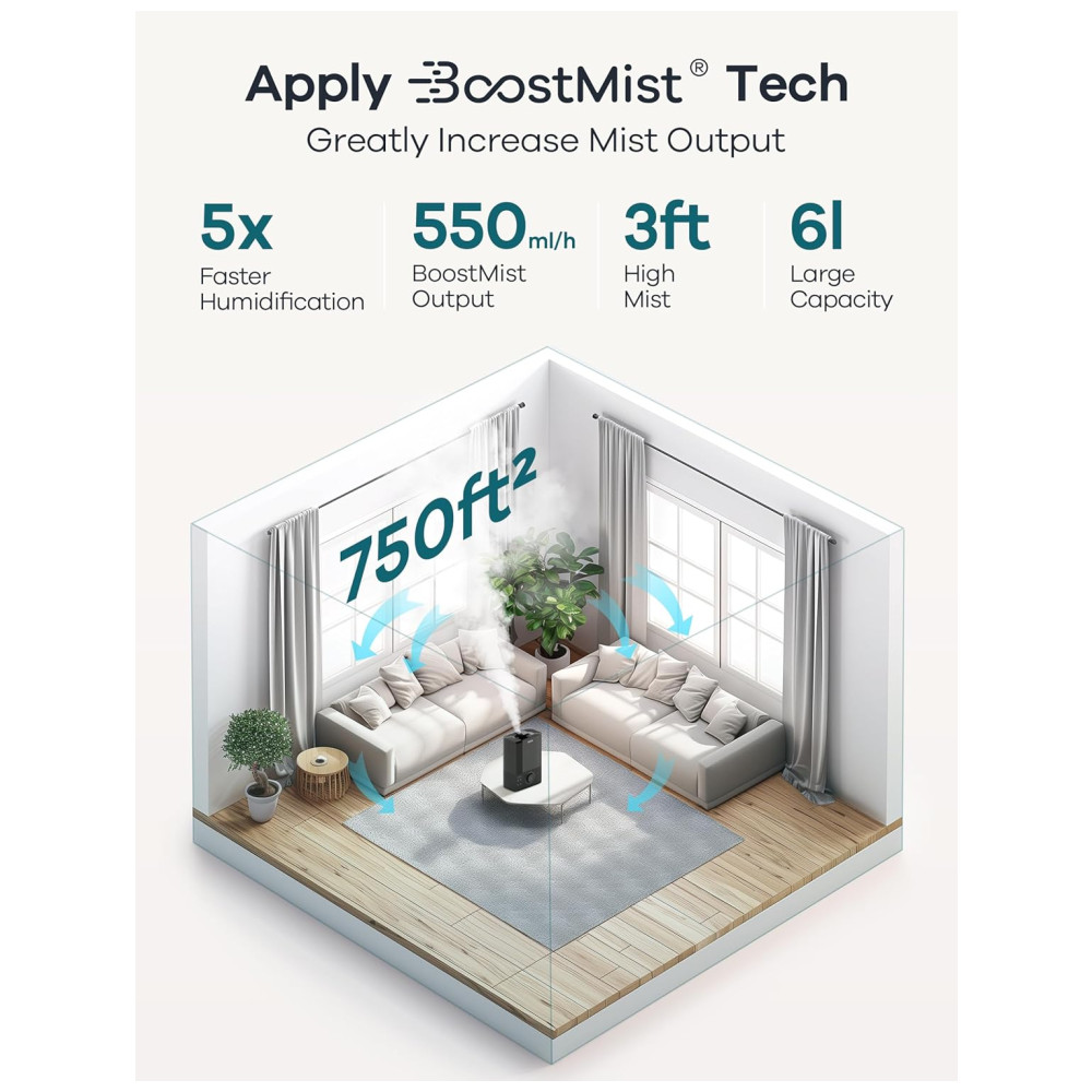 O umidificador ultrassônico BoostMist H600 Pro é potente e eficiente, equipado com um atomizador personalizado e ventilador Altawind, alcançando uma saída de até 550 ml/h. Seu design TopFill facilita a limpeza, e com um tanque de 6 litros, ele pode operar por até 90 horas, reduzindo a frequência de reabastecimento. Além disso, ele consegue aumentar a umidade em 20% em apenas 10 minutos, sendo 5 vezes mais rápido que outros modelos de névoa fria.
