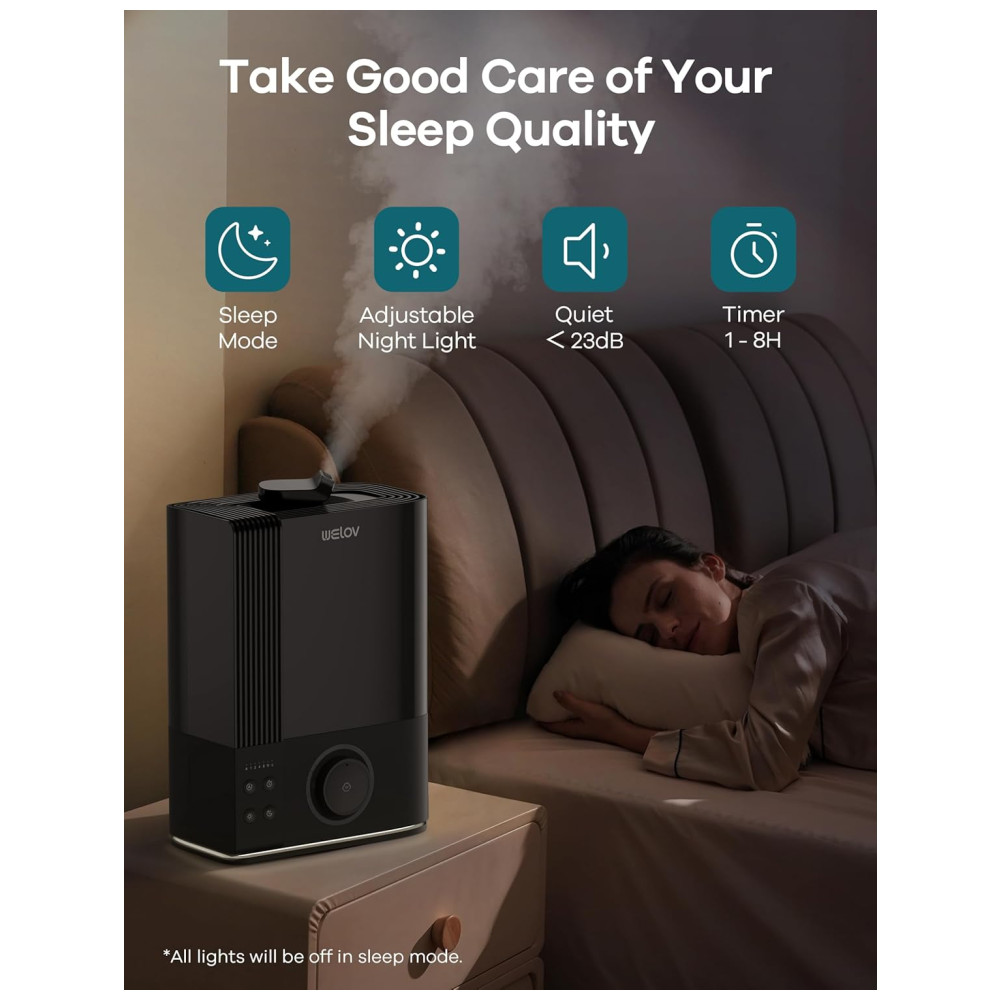No modo de espera, o umidificador opera a menos de 23,0 dB, ideal para pessoas com sono leve, garantindo uma noite tranquila. As luzes noturnas ajustáveis podem ser facilmente ligadas ou desligadas conforme sua preferência. Feito sem BPA, o umidificador assegura um ambiente saudável para sua família, bebês, animais de estimação e plantas.