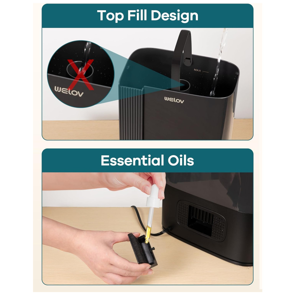 Com um botão prático para ajustar a saída de névoa, o dispositivo possui uma grande abertura que torna a limpeza ainda mais fácil e evita transbordamentos. Ele também atua como um difusor de óleo essencial, permitindo que você desfrute de uma névoa calmante com fragrâncias relaxantes.