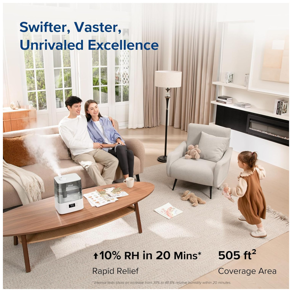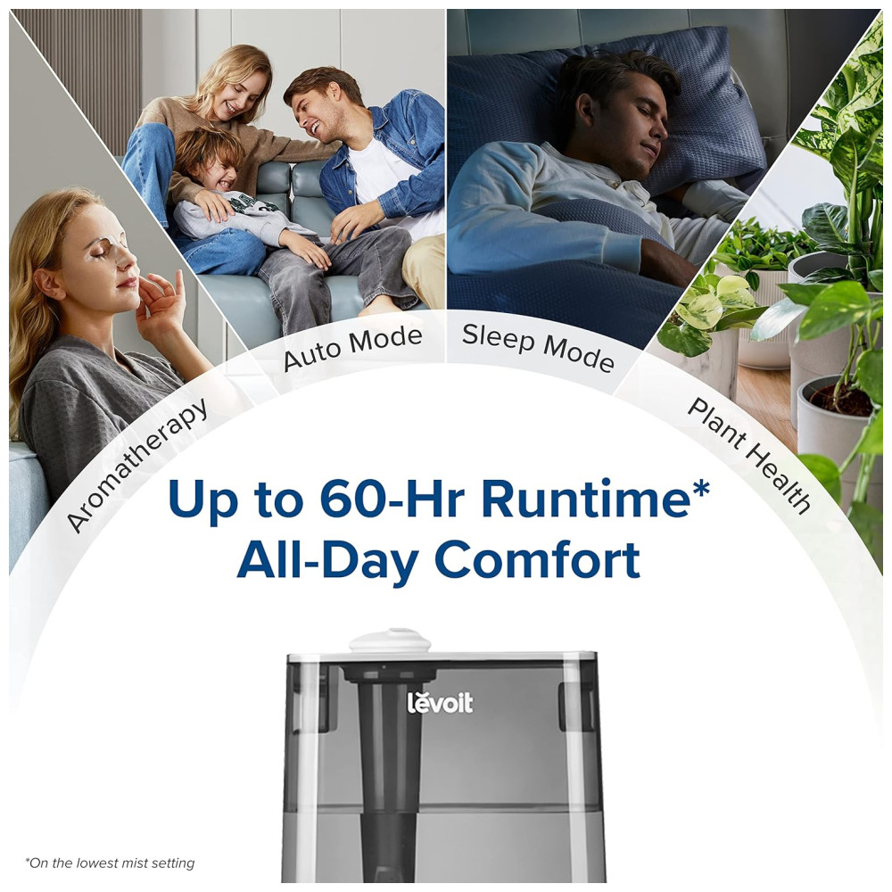 Umidificador Cool Mist Desfrute de uma névoa calmante que umidifica salas de 19 a 46 metros quadrados, escritórios, viveiros e ambientes de fábrica por até 60 horas sem reabastecimento, graças ao tanque compacto de 6 litros