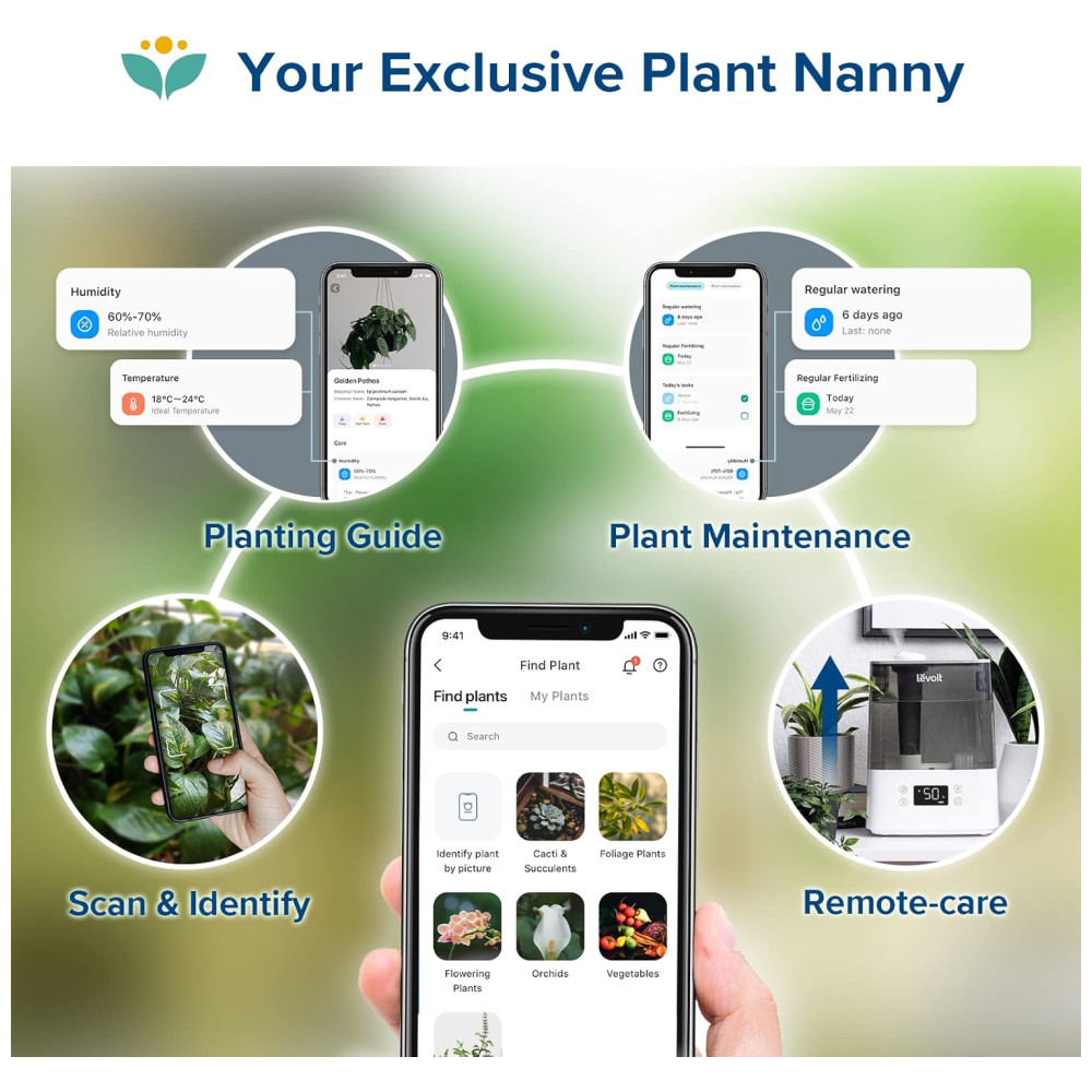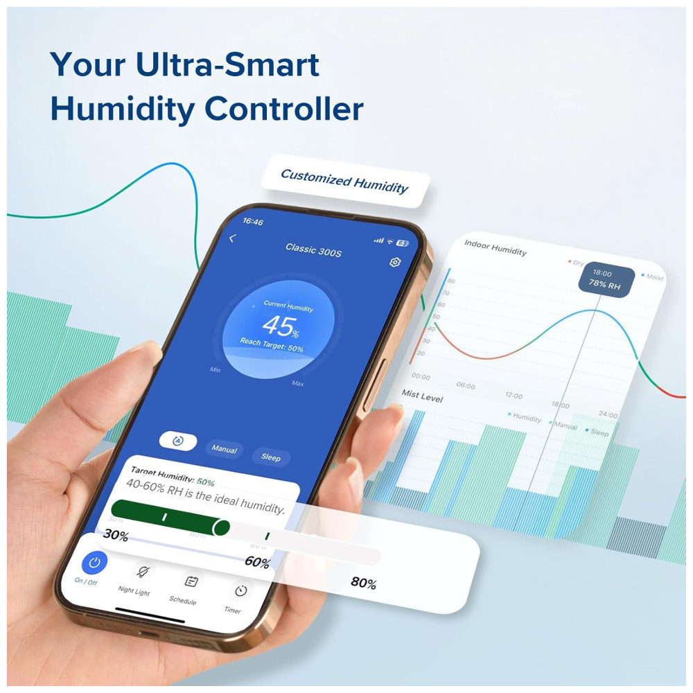 Controle inteligente e de voz conecte o umidificador inteligente ao aplicativo VeSync gratuito para controle remoto e conecte se a assistentes de voz de terceiros, como AMZ Alexa e Google Assistant para controle mãos livres. Funciona com uma rede estável de 2,4 GHz