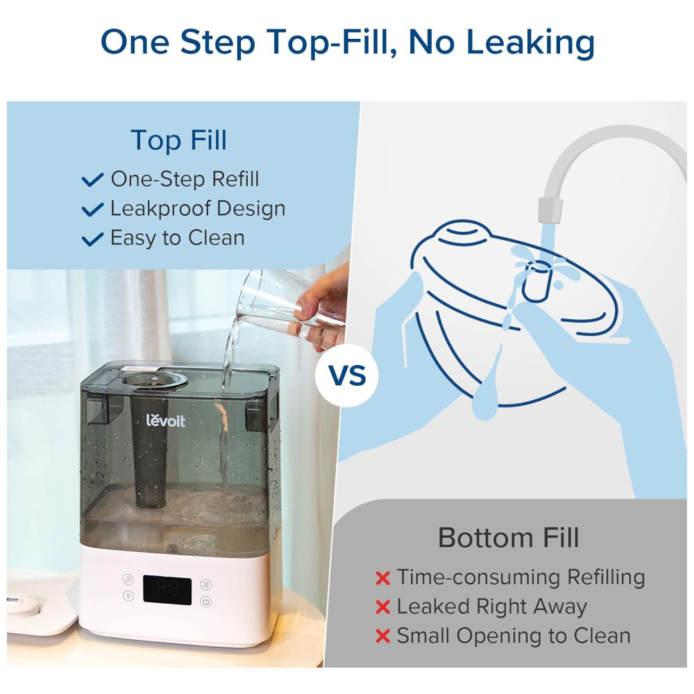 Fácil de recarregar e limpar não há necessidade de virar de cabeça para baixo o umidificador de enchimento superior torna a limpeza e recarga rápida e sem respingos. Veja facilmente os níveis de água atuais através do tanque transparente