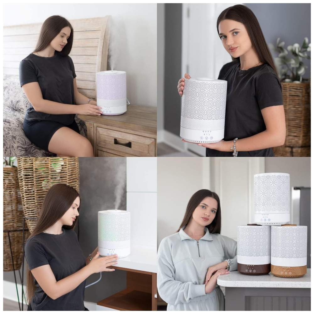 Umidificador grande de alta saída de névoa feito com materiais de qualidade premium além de seu uso em aromaterapia, este difusor de óleo essencial também funciona como umidificador. Use o para melhorar a qualidade do ar e do ambiente de sua casa, encobrir o cheiro de animais de estimação ou fumar e proteger sua família do ar excessivamente seco, microorganismos, alérgenos, poeira e muito mais