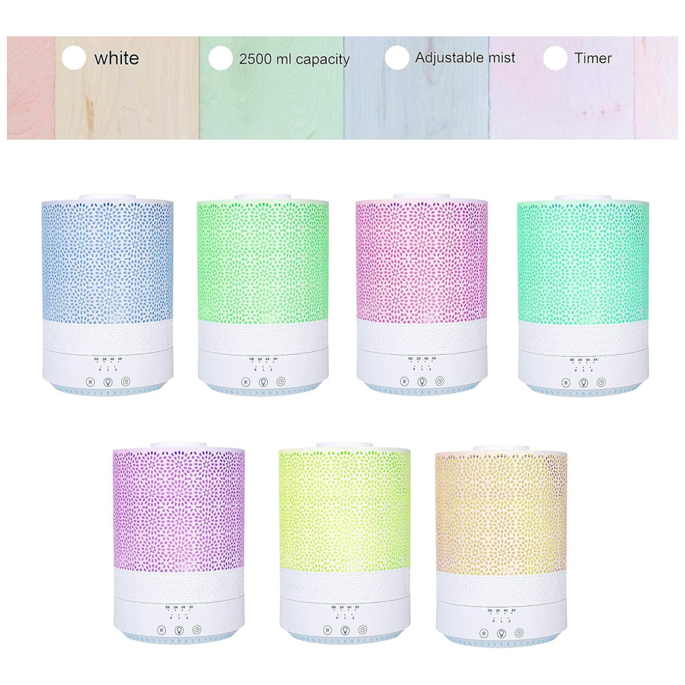 Dispositivo multifuncional de aromaterapia, difusor de óleo essencial extra grande Este difusor de óleo essencial é um dispositivo de aromaterapia incrível como nenhum outro que você já usou. Ele possui um tanque de água de 2500 ML enorme e fácil de limpar, 7 cores de luz LED diferentes, vários modos de névoa, bem como um interruptor automático de segurança que evita o superaquecimento no caso de ficar sem água.
