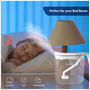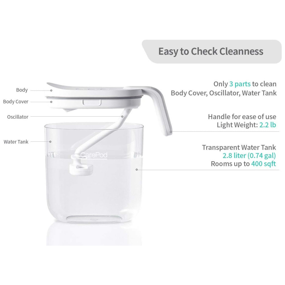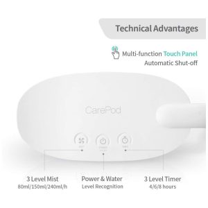 O Carepod Mini MS021P é um umidificador ultrassônico com design transparente e sistema de fácil desmontagem em apenas 3 peças laváveis: tampa, bastão oscilador e reservatório de água arredondado. Oferece alívio para pele seca, alergias e desconfortos relacionados ao ar seco, atuando em ambientes de até 32 m². Possui capacidade de 2,8 litros, possibilitando até 20 horas de funcionamento contínuo na intensidade mínima (100 ml/h) e 10 horas na máxima (300 ml/h), ajustável em três níveis. Livre de filtro, é mais higiênico e permite higienização sem pontos ocultos de acúmulo de impurezas. O funcionamento é silencioso e seguro: desliga automaticamente ao detectar baixo nível de água. Indicado para uso em quartos, ambientes infantis, escritórios e uso residencial.