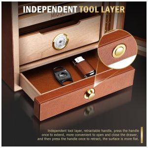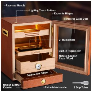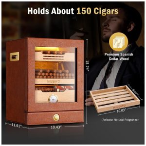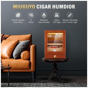 O Armário de Charutos MIUGUYO combina luxo e elegância com sua estrutura de couro especial por fora e cedro espanhol por dentro. O cedro libera óleos naturais, mantendo a umidade ideal para 150 charutos, evitando ressecamento e mofo. Com sistema de iluminação LED ajustável, controle preciso de umidade, capacidade para diferentes tamanhos de charutos e gaveta separada para acessórios. Além disso, é um presente ideal para qualquer amante de charutos, adicionando um toque de sofisticação a qualquer ambiente.