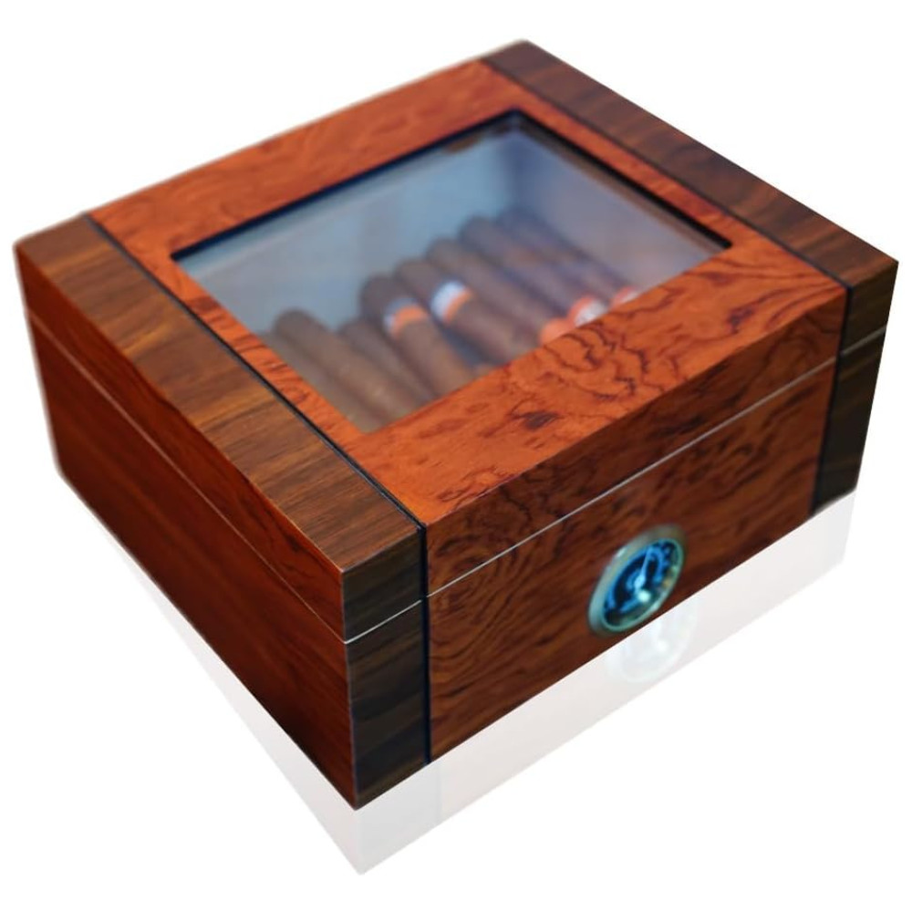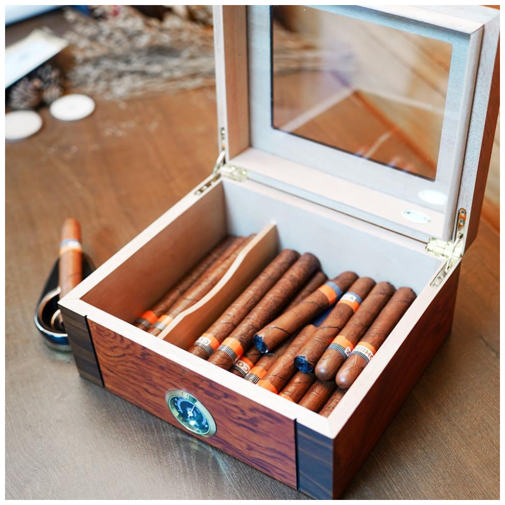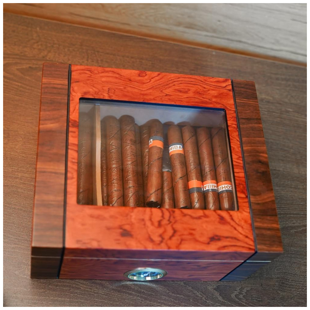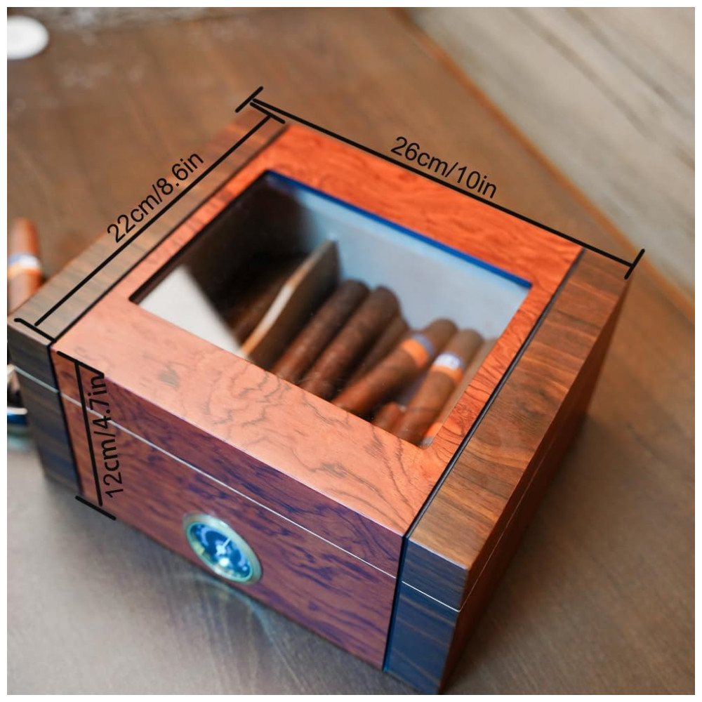 Mantenha seus charutos frescos com o revestimento de cedro espanhol e vedação superior para um equilíbrio ideal de umidade e umidade. A frescura suprema do charuto é garantida em nosso umidor meticulosamente elaborado! O revestimento de cedro espanhol mantém a umidade ideal, e a vedação hermética mantém o equilíbrio perfeito de umidade, tornando-o ideal para armazenamento de charutos. Possui um preciso higrômetro analógico para manter a umidade ideal. Surpreenda seu amante de charutos com nossa elegante caixa umidificadora de charutos. Feita com design contrastante de nogueira preta e jacarandá, possui um revestimento interno de cedro espanhol que mantém os charutos preservados e aromáticos. Um presente ideal que certamente aumentará o prazer de fumar charutos. Artesanato Inigualável em Cedro Espanhol! Desfrute da beleza do nosso pequeno umidor de charutos feito de cedro espanhol. Seu design requintado, combinado com materiais de alta qualidade e atenção meticulosa aos detalhes, impressionará você e seus convidados. Capacidade Ideal para Sua Coleção de Charutos! Nossos umidores de charutos são projetados para armazenar de 35 a 60 charutos, dependendo do tamanho do anel. O divisor removível de cedro facilita a organização da sua coleção de charutos. Um item indispensável para conhecedores de charutos, esses umidores oferecem funcionalidade e estilo.