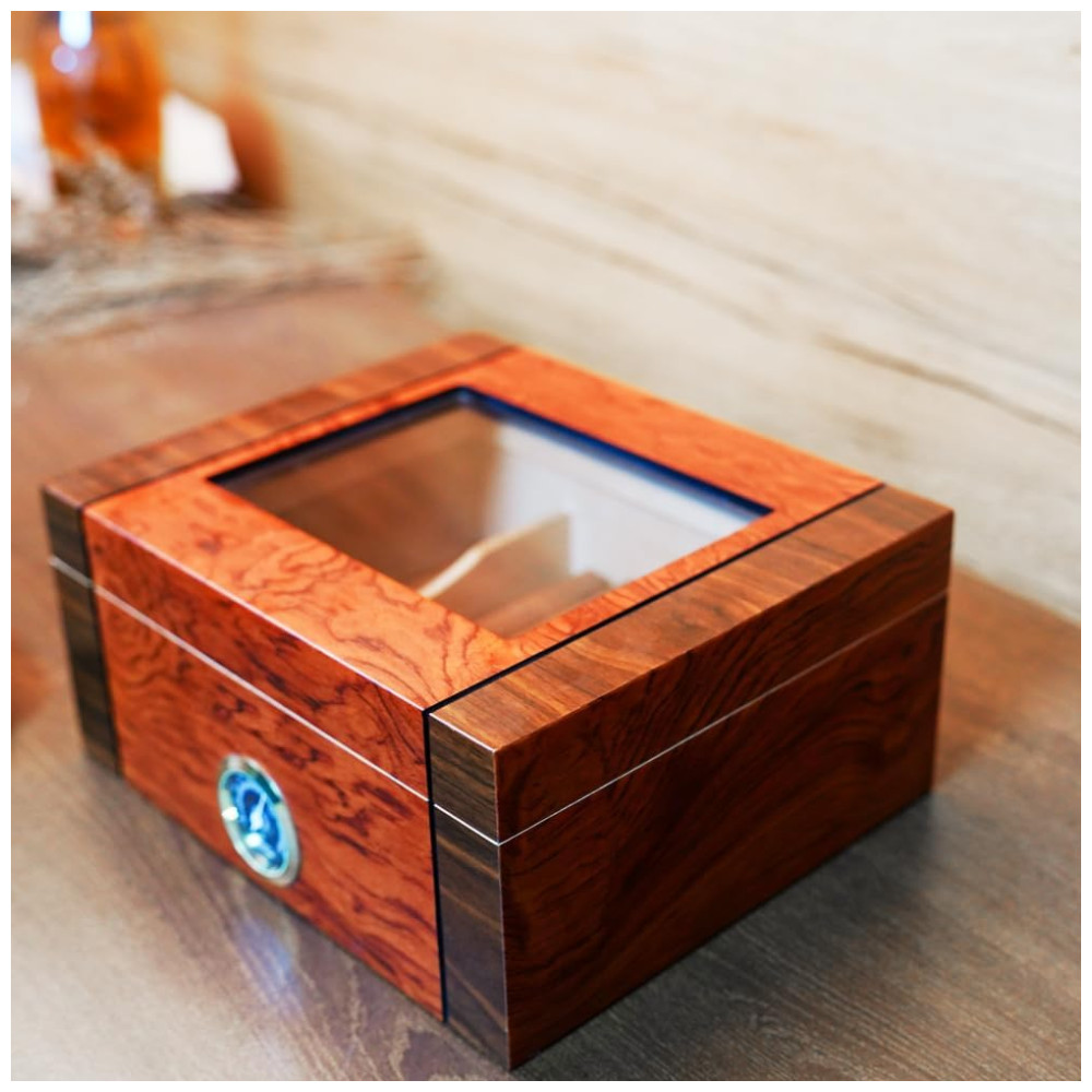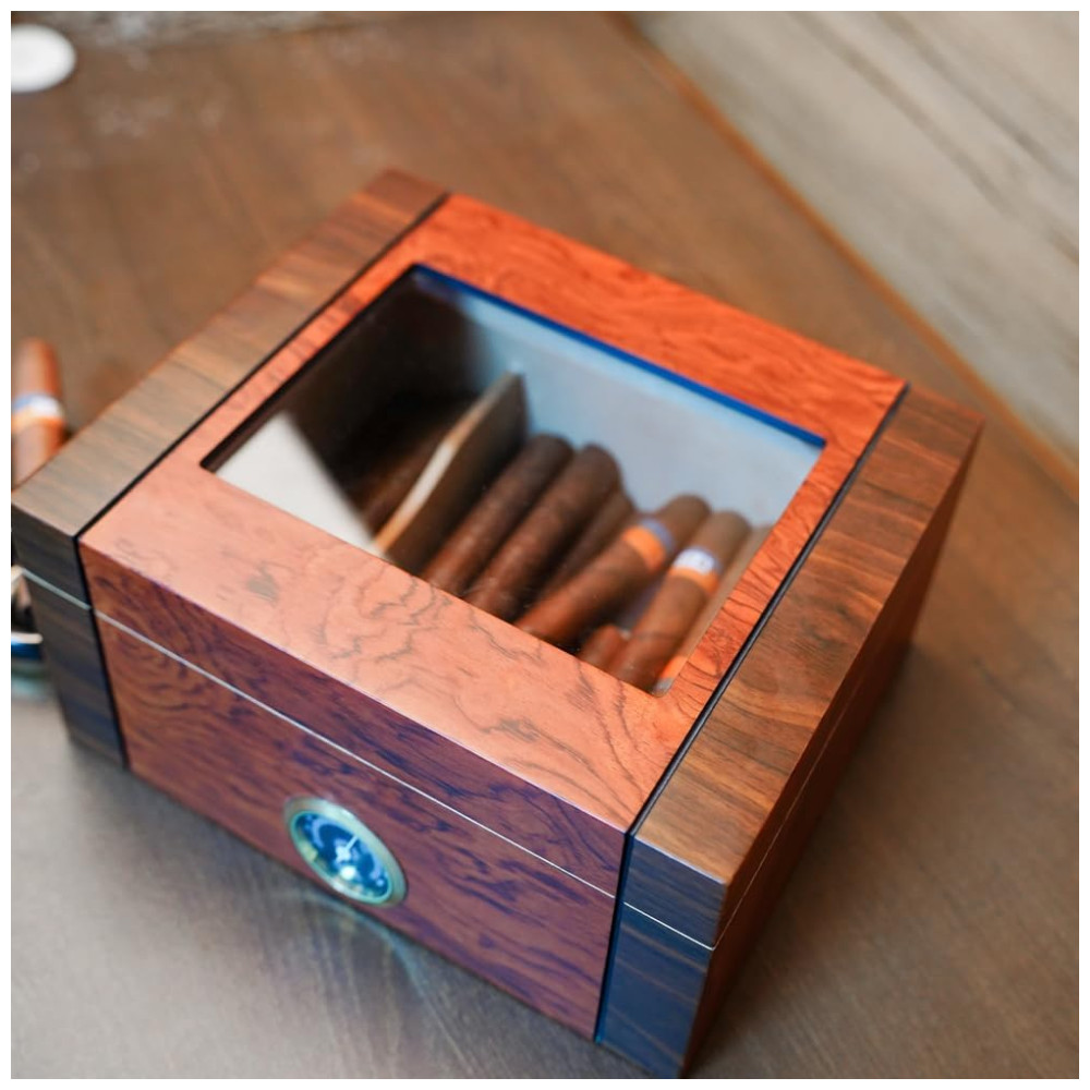 Umidor Artesanal em Nogueira Preta e Jacarandá Cedro Espanhol Design Colorido Tampa de Vidro e 100 CharutosNidivey
