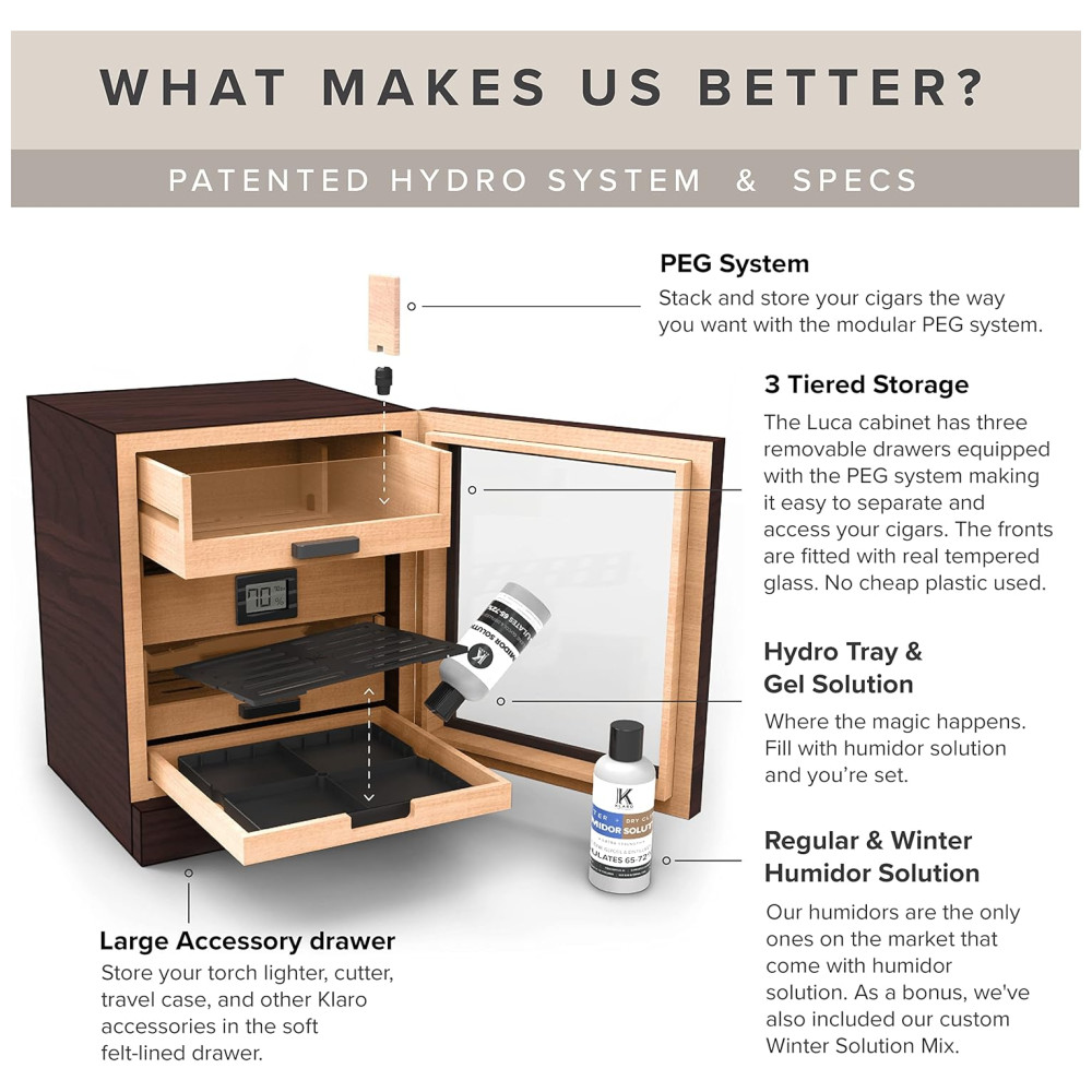 Reabastecimento Facilitado: O Luca conta com uma gaveta separada para acomodar o Hydro Tray, permitindo fácil acesso para reabastecer com a solução de umidificação, sem a necessidade de retirar ou manipular os charutos. O Sistema Hydro é a solução mais prática para manutenção da umidade e preparação do humidor.